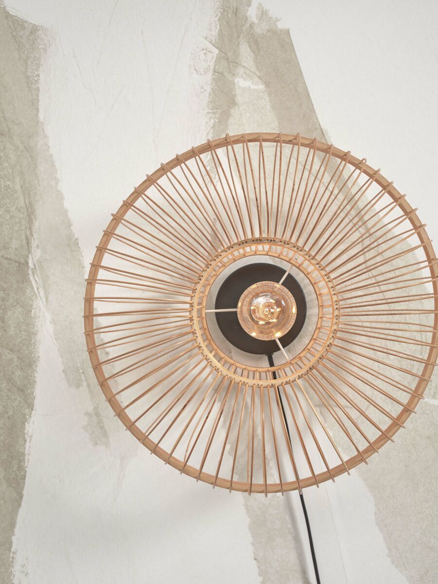 Wandlamp van natuurlijk bamboe in oosterse stijl, ideaal voor eetkamer, hal, slaapkamer of woonkamer. Voorzien van een grote E27 fitting en stofdicht (IP20). Voeg een rustieke en exotische touch toe aan je interieur met deze unieke en stijlvolle lamp.