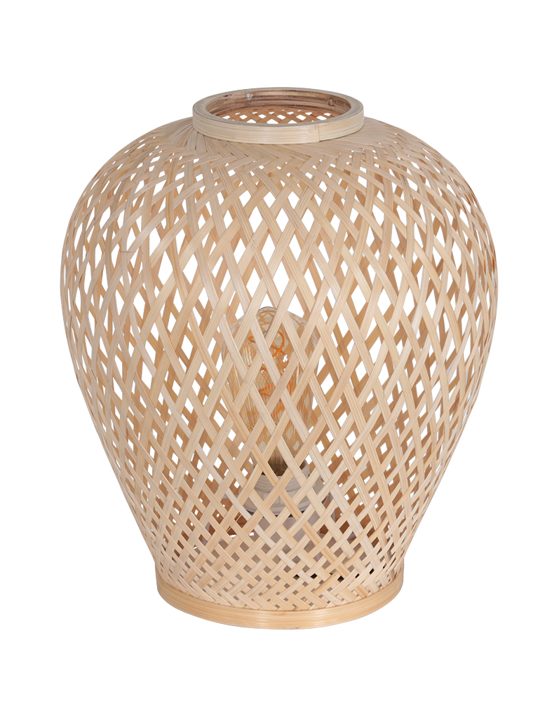 Sfeervolle verlichting voor op tafel of op een laag kastje krijg je met de bamboe tafellamp. De lichtbron is aan de onderkant van de lamp bevestigd. Hierdoor krijg je, ook als de lamp op een laag tafeltje staat, een bijzonder lichteffect. Dat wordt nog eens benadrukt door de mazen in het vlechtwerk. Deze lamp past goed in een retro of natuurlijk interieur.