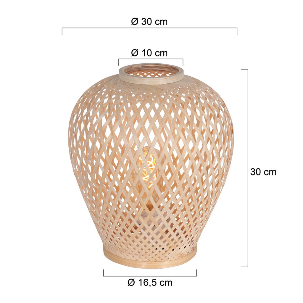 De Maze tafellamp combineert speels design met een natuurlijke uitstraling. De vaasvormige kap van blank bamboe zorgt voor een sfeervol lichtspel op de muren. Met een hoogte en diameter van 30 cm is deze lamp ideaal voor een bijzettafel of nachtkastje. Voorzien van een E27 fitting en een snoerschakelaar voor eenvoudig gebruik.