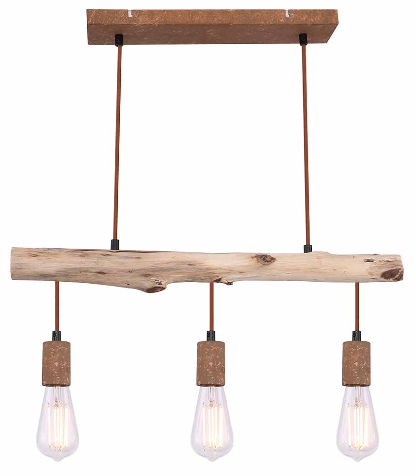 Verrijk uw interieur met deze vintage hanglamp JAKOB, gemaakt van roestkleurig metaal met drie E27 fittingen op een houten balk voor een gezellige sfeer.