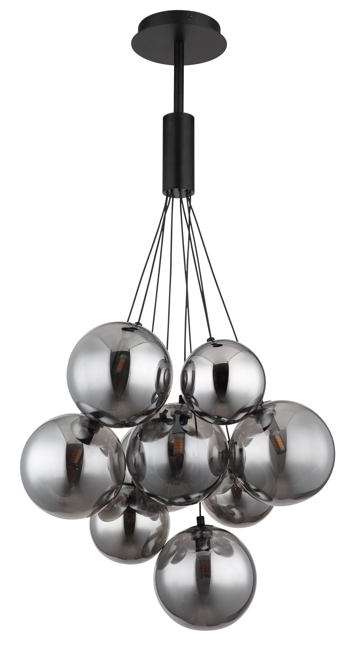 De pendantlamp Balgi is een prachtig voorbeeld van eigentijds design en biedt talloze ontwerpmogelijkheden. Deze ronde lamp is uitgerust met negen glazen hangers in diverse diameters: twee hangers van 10 cm, drie van 12 cm en vier van 15 cm. De elegant rokerige kleur van de glazen bollen creëert een warme en sfeervolle ambiance in elke ruimte.