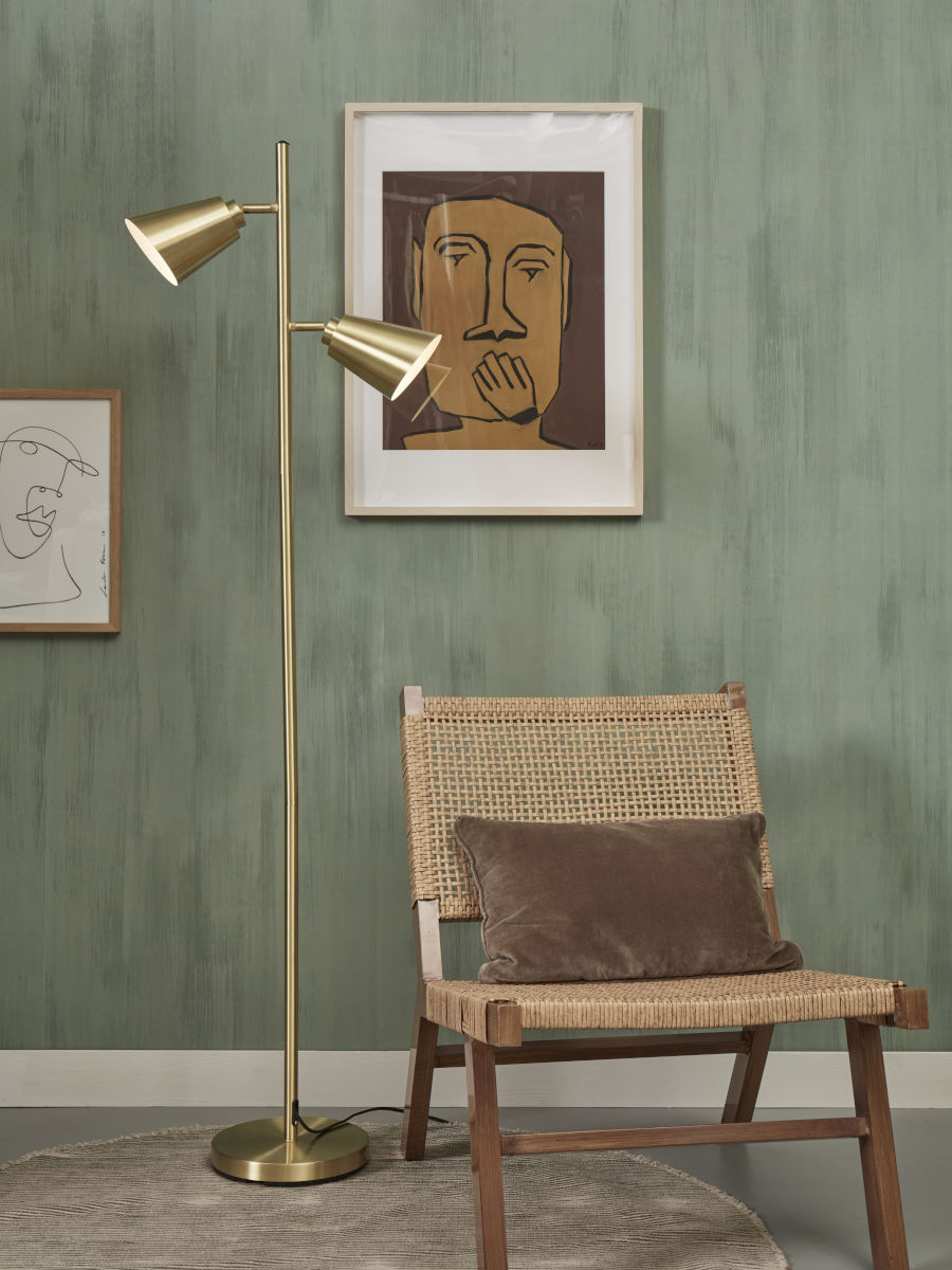 De goudkleurige 2-lichts vloerlamp Bremen brengt een vleugje glamour naar je eetkamer of thuiswerkplek. Deze draaibare lamp, vervaardigd uit metaal, biedt praktische verlichting en een luxe uitstraling, met een E27 fitting en IP20 bescherming.