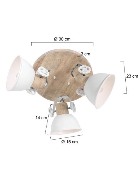 De witte Gearwood plafondspot is een speelse en stijlvolle toevoeging aan ieder interieur. De drie verstelbare spots met houten fittinghouders zorgen voor gerichte verlichting, terwijl de zwart-wit omwikkelde draden een speels accent geven. De lamp heeft een E27 fitting en is geschikt voor lichtbronnen tot 40 Watt. De houten plafondplaat heeft een diameter van 30 cm, en de metalen kappen hebben een diameter van 15 cm. Met een totale hoogte van 19 cm en de mogelijkheid om te dimmen met een externe dimmer (niet meegeleverd), is dit een functionele én decoratieve lamp.