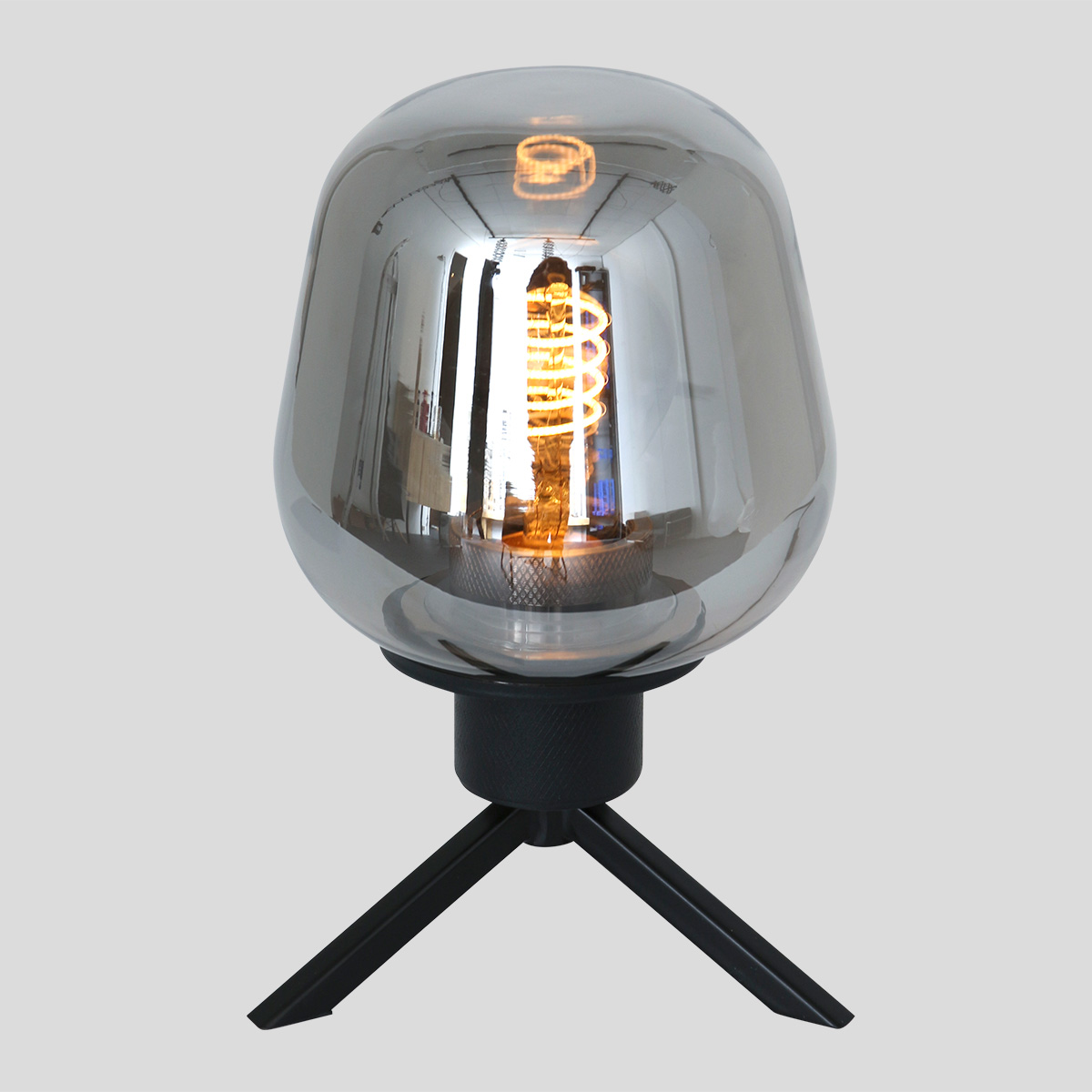 De zwarte tafellamp uit de Reflexion-serie combineert een elegant design met sfeervolle verlichting. De spiegelende rookglazen kap en de metalen driepoot geven de lamp een moderne uitstraling. Met een hoogte van 23 cm is hij ideaal voor tafels of nachtkastjes. Uitgerust met een E27-fitting, geschikt voor lichtbronnen tot 40 Watt. Het snoer van 150 cm heeft een aan/uit-schakelaar voor gebruiksgemak.