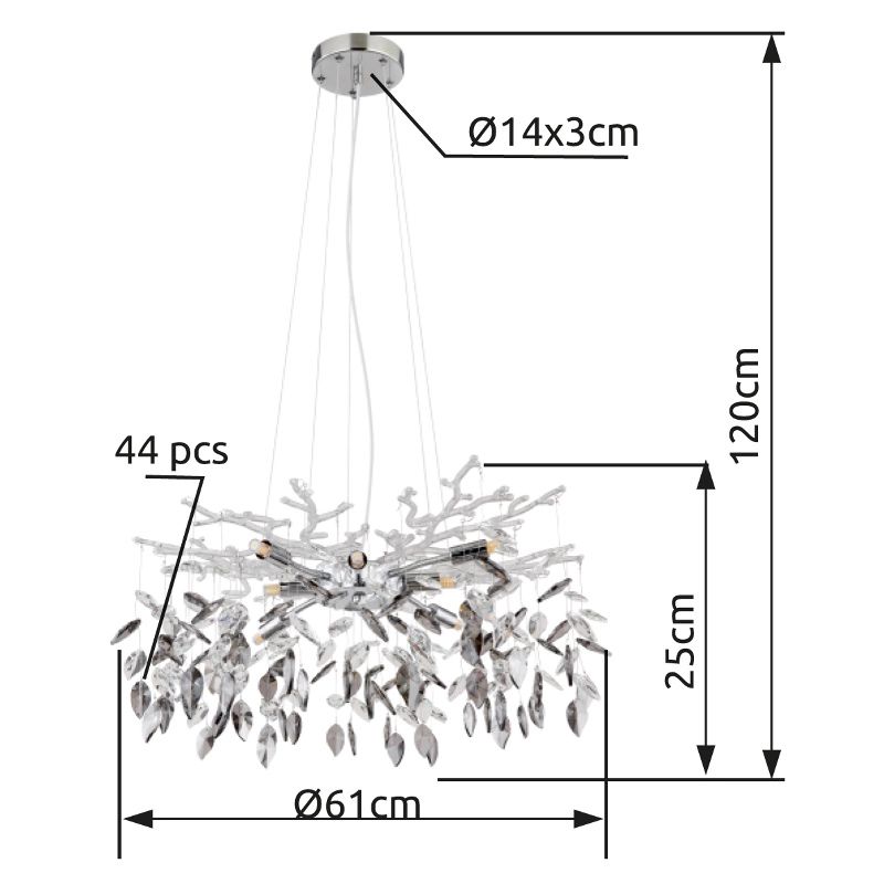 De DANNA kroonluchter is een opvallend designstuk dat elke ruimte in uw interieur verfraait. Met zijn ronde en elegante vormgeving voegt hij een luxe sfeer toe die niemand onopgemerkt laat. Gemaakt van chroomgeplateerd metaal combineert deze kroonluchter stabiliteit met een vleugje glamour. De kap, vervaardigd uit zowel rookkleurige als heldere glazen kristallen, reflecteert het licht op een prachtige manier en creëert een indrukwekkend verlichtingseffect. Dit sprankelende element maakt de lamp tot een echte eyecatcher in uw huis.