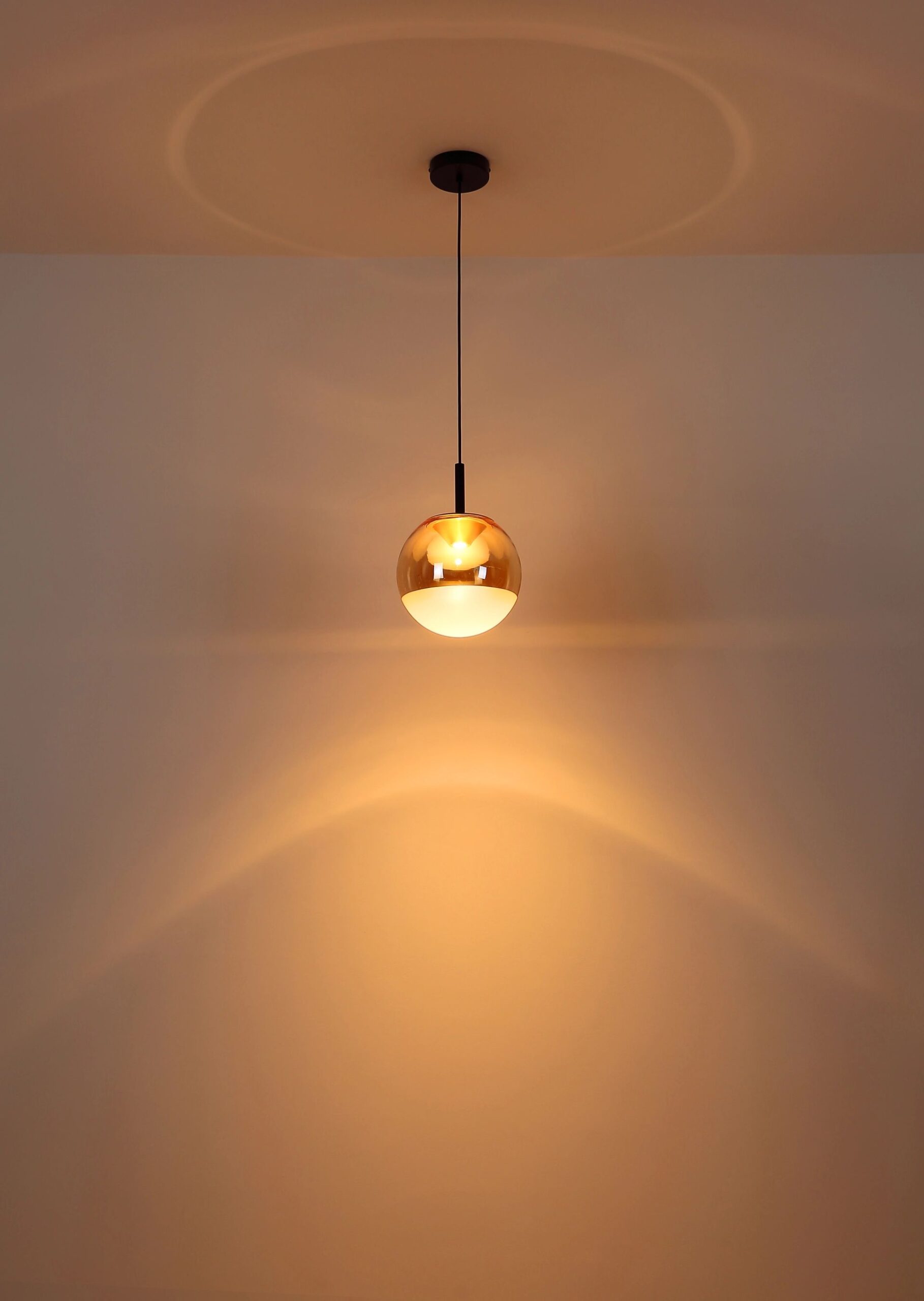 De SEVERIN hanglamp voegt een vleugje elegantie en moderniteit toe aan uw interieur. Met zijn glazen bol en satijnachtige amberkleurige afwerking in combinatie met een matzwart metalen frame, biedt deze lamp een stijlvolle uitstraling. De messingkleurige aluminium kap accentueert het chique ontwerp en harmoniseert perfect met het zachte licht van de geïntegreerde LED-technologie. Met een diameter van 250 mm is deze lamp bijzonder geschikt voor kleinere ruimtes of als sfeervolle accentverlichting boven eettafels, keukeneilanden of in gangen.