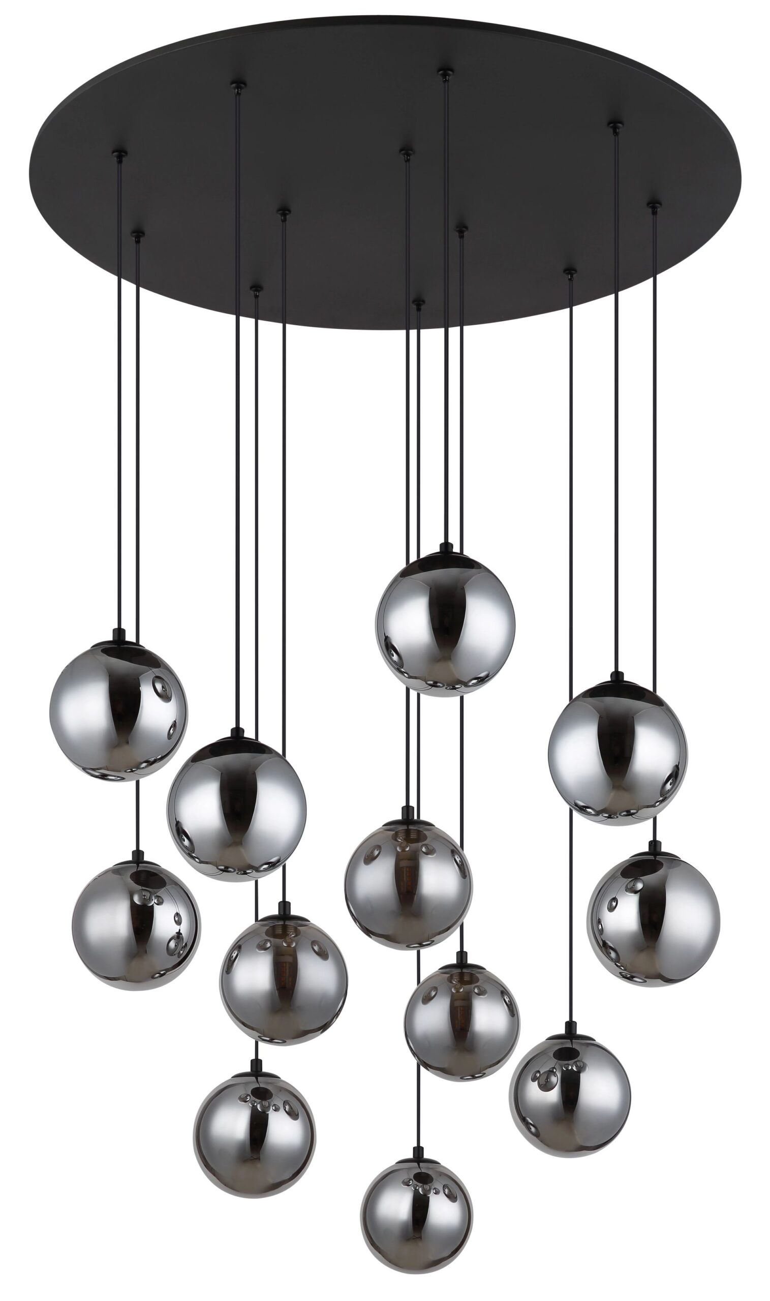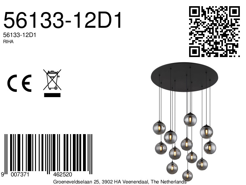 De RIHA plafondlamp heeft een elegante ronde vorm en wordt ondersteund door twaalf fraaie hangers met rookkleurige glazen bollen. Dit armatuur is gemaakt van zwart gelakt metaal met een matte afwerking, wat bijdraagt aan de moderne uitstraling. Met een diameter van 750 mm is deze lamp ideaal voor grotere ruimtes en voegt het een stijlvol element toe aan elk interieur. De lamp biedt een indrukwekkende lichtopbrengst van 130 lumen bij een kleurtemperatuur van 3000 K, wat zorgt voor een aangename en warme ambiance.