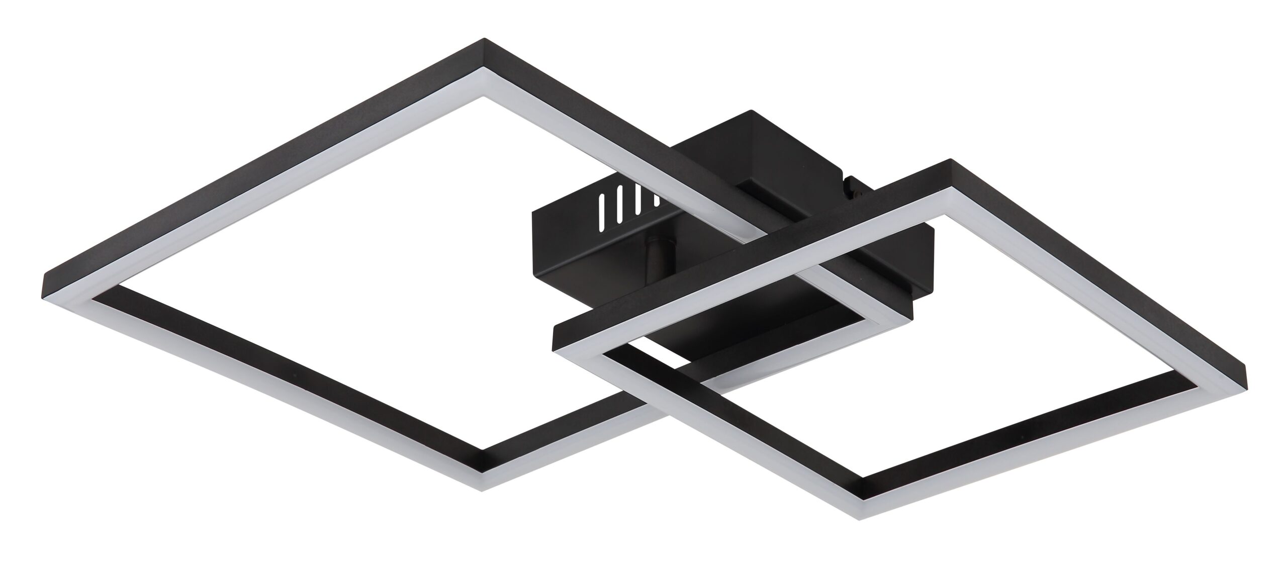 De TYLER plafonnière biedt een elegante mix van innovatief en tijdloos design. Met zijn rechthoekige vorm en twee naast elkaar geplaatste vierkanten creëert deze lamp een opvallende structuur die onmiddellijk de aandacht trekt. Een van de frames is draaibaar, waardoor je de lamp eenvoudig kunt afstemmen op jouw voorkeuren. Het ontwerp is gemaakt van matzwart kunststof en bevat een opalen lampenkap, die zorgt voor een sfeervolle uitstraling in elke ruimte.