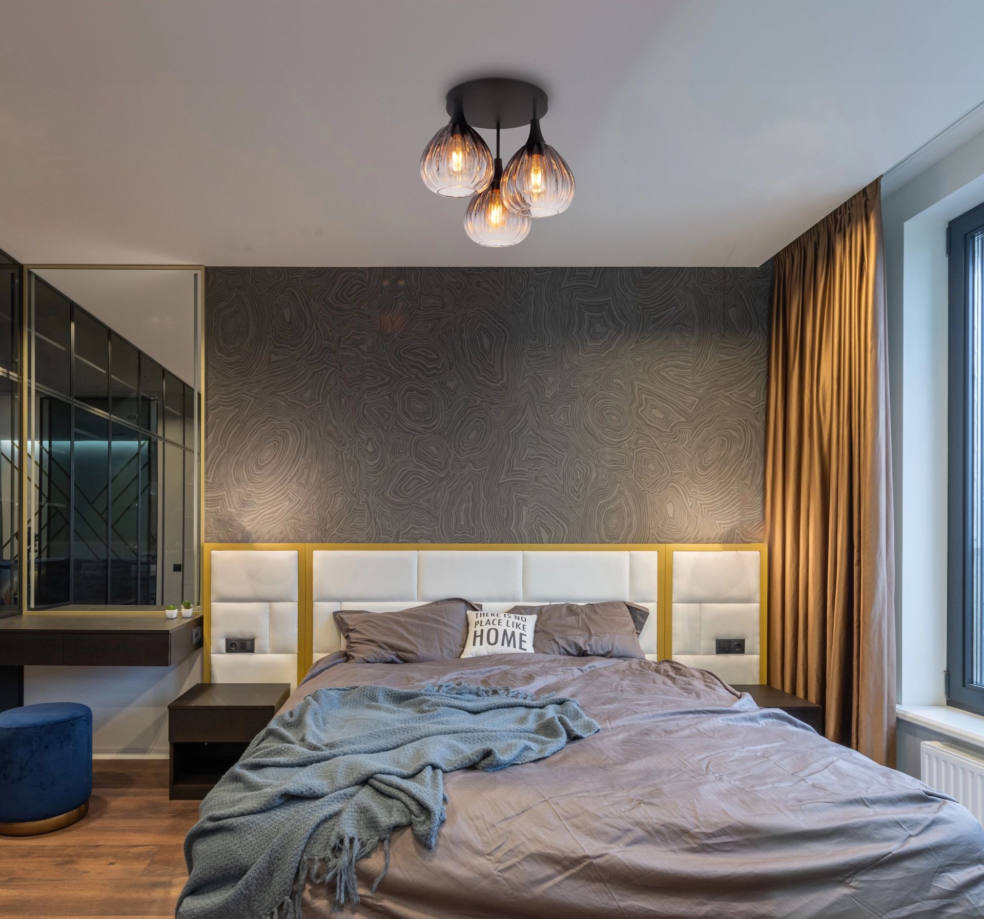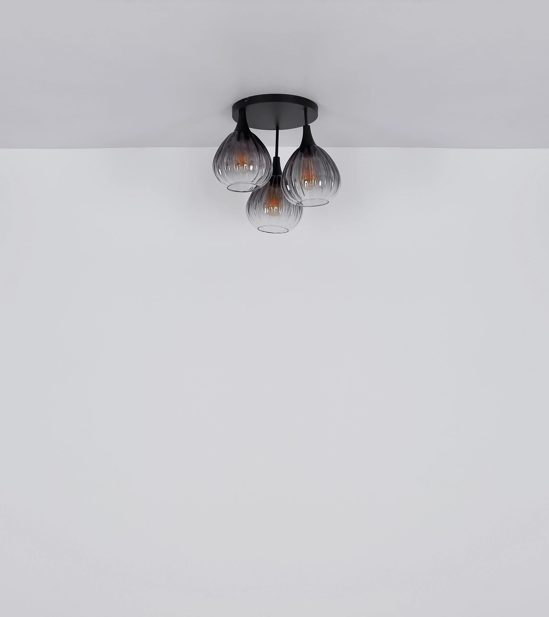 De OLSEN plafondlamp heeft een stijlvolle ronde vorm en bestaat uit drie bolvormige glazen met prachtige groeven die samen een harmonieus geheel vormen. Het armatuur is vervaardigd uit mat zwart metaal, terwijl de lampenkap is gemaakt van helder, rokerig en gebogen glas. Deze combinatie zorgt ervoor dat de lamp een warme en uitnodigende sfeer uitstraalt, ideaal voor de verlichting van woonkamers, eetkamers of ontvangstruimtes.