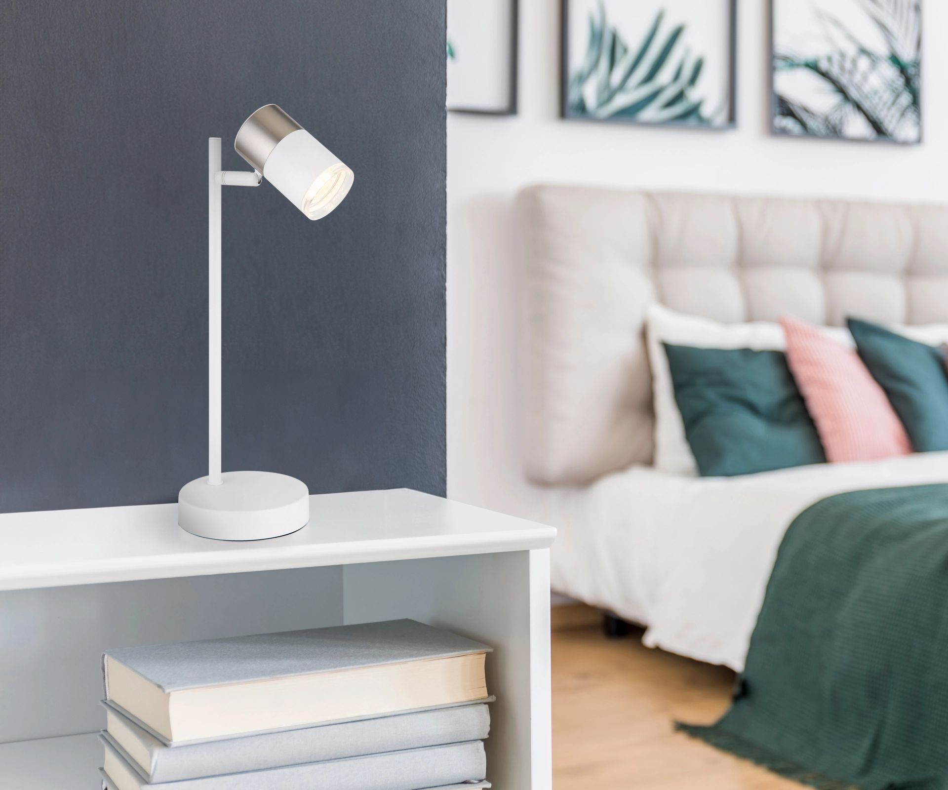 Met een lengte van 132 mm en een breedte van 120 mm is deze tafellamp ideaal voor op uw bureau, nachtkastje of bijzettafel, en biedt zij een aangename lichtbron. De schakelaars op de kabel maken het eenvoudig om de lamp te bedienen. Voeg stijl en helderheid toe aan uw interieur met deze fraaie tafellamp van wit metaal en creëer een gezellige sfeer met een eigentijds design.
