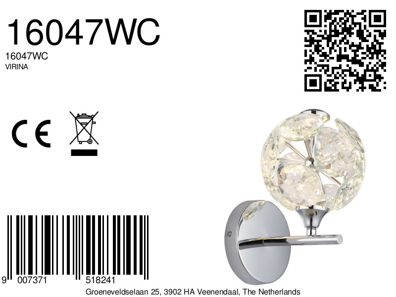 De VIRINA wandlamp combineert elegant design met hoogwaardige technologie, waardoor het stijlvolle accenten toevoegt aan jouw interieur. De metalen behuizing met chroomafwerking is uitgerust met een bol van helder K9 kristal. Deze kristallen vangen het licht op een betoverende manier, wat resulteert in een sprankelend en luxe lichteffect. Met een breedte van 150 mm en een hoogte van 185 mm is deze lamp perfect voor kleinere kamers of als subtiele verlichting in gangen.
