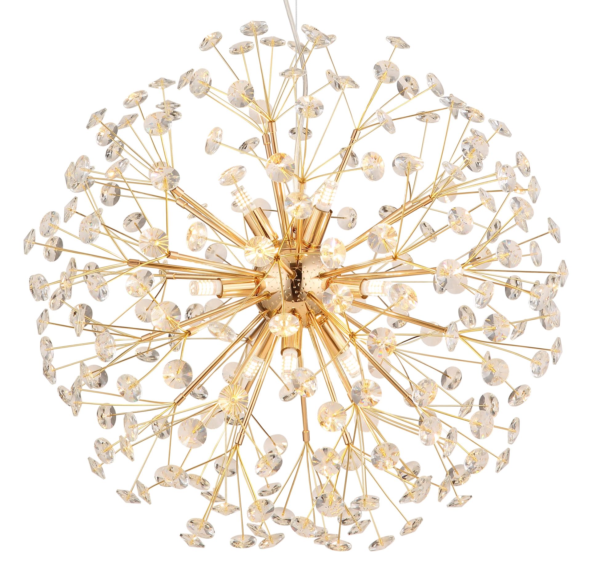 Maak kennis met de KATRINA kroonluchter, vervaardigd uit goudkleurig metaal en voorzien van sprankelende K9 kristallen. Deze imposante bolvormige lamp is een ware blikvanger, met een ontwerp dat de traditionele elegantie benadrukt. De gouden behuizing en de heldere K9 kristallen kap zorgen samen voor een betoverend lichtspel dat elke ruimte een luxe uitstraling geeft. Met negen G9 LED-lampen straalt deze kroonluchter een warme gloed uit, met een kleurtemperatuur van 3000K en een lichtopbrengst van 350 lumen.