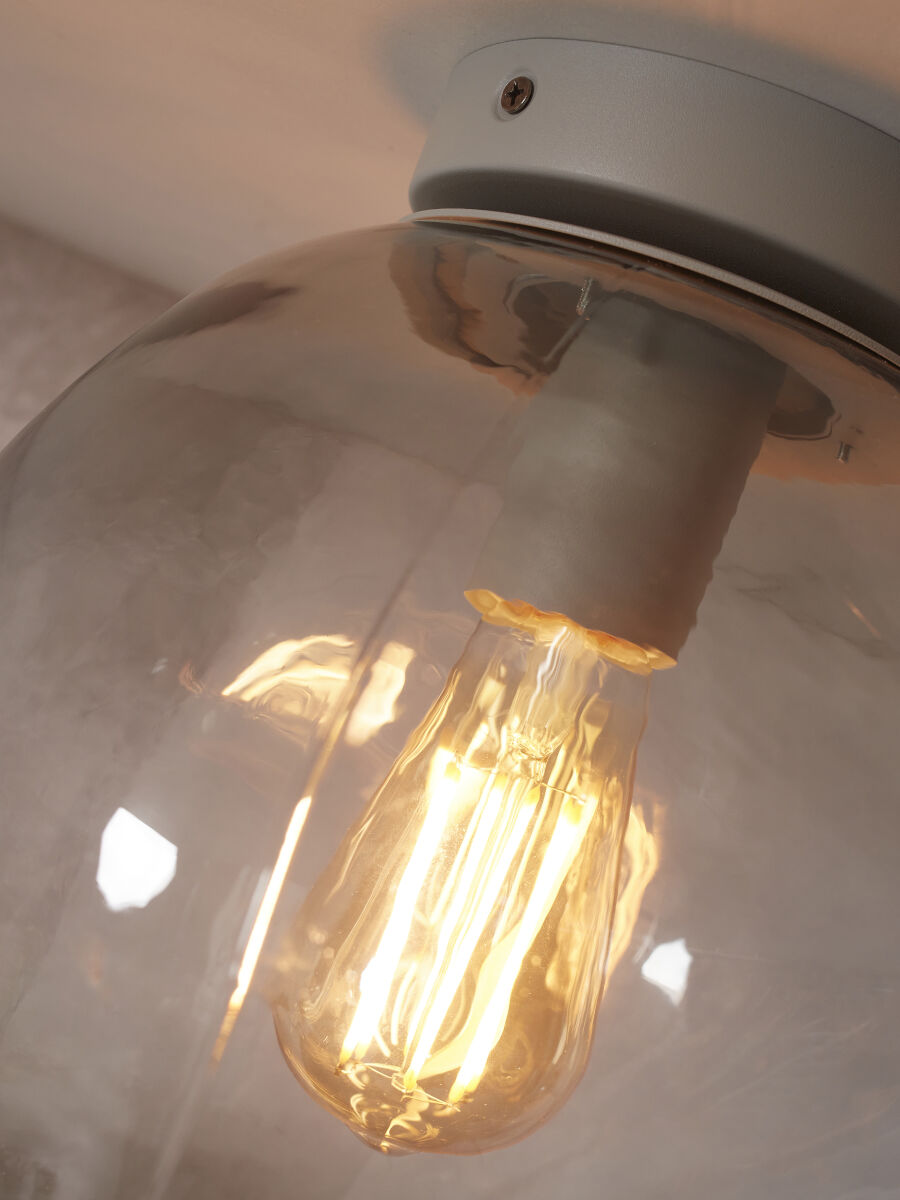 Grijze plafondlamp van metaal en glas, perfect voor een moderne inrichting in eetkamer, hal, slaapkamer of woonkamer. Voorzien van een grote E27 fitting en stofdicht (IP20). Voeg een chique en verfijnde touch toe aan je interieur met deze stijlvolle lamp die elegantie en functionaliteit combineert.