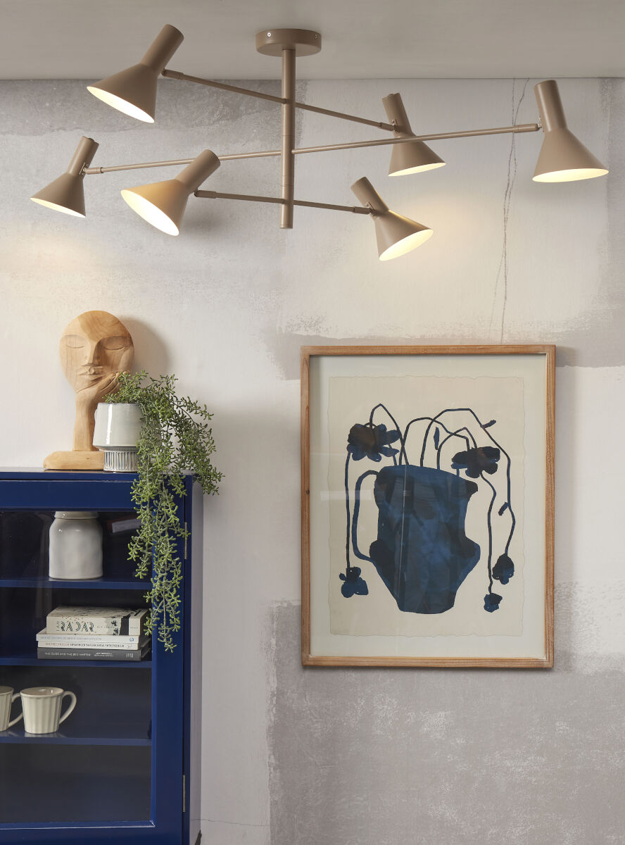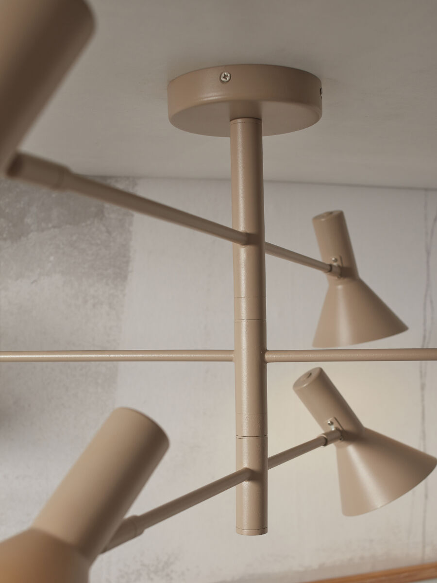 Grijze retro plafonnière van metaal, perfect voor de eetkamer. Voorzien van zes kleine E14 fittingen en stofdicht (IP20). Deze lamp combineert een klassieke uitstraling met moderne elegantie. Het metalen ontwerp in grijs zorgt voor een stijlvolle en verfijnde ambiance. Ideaal om een elegante en uitnodigende eetomgeving te creëren met een retro flair.