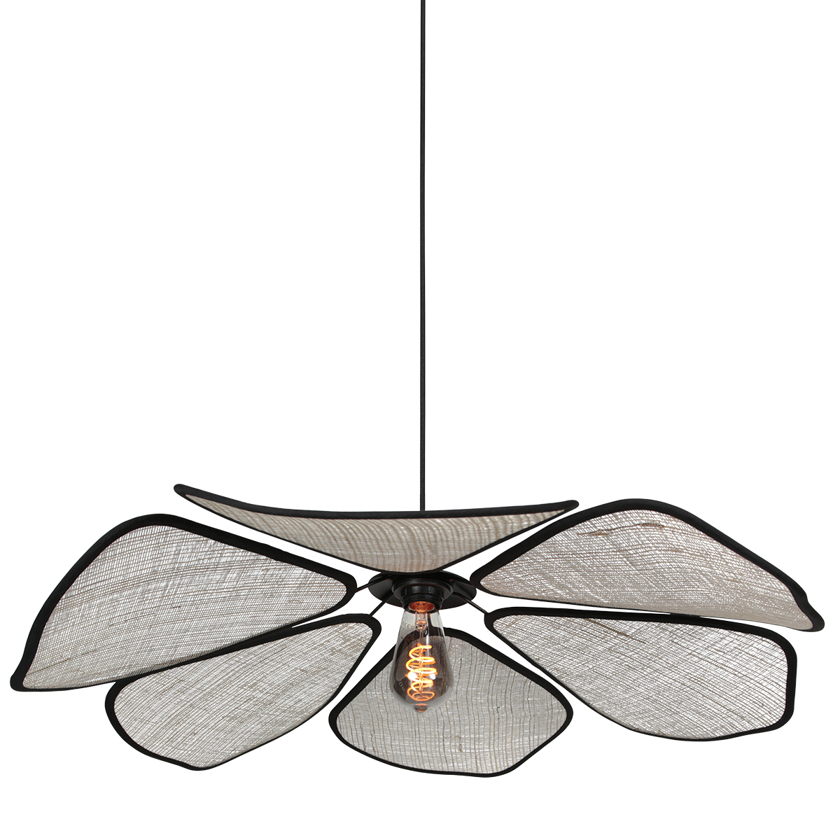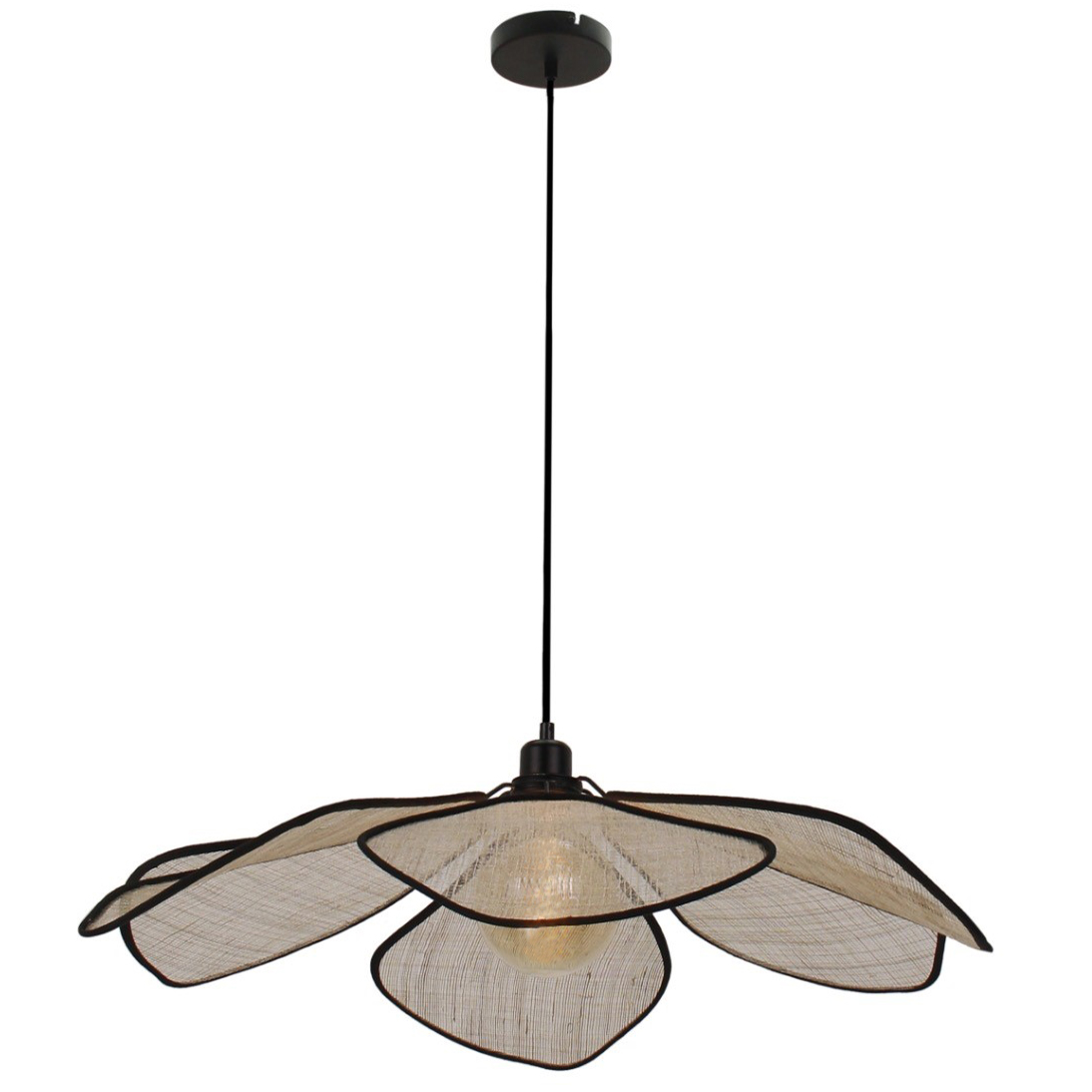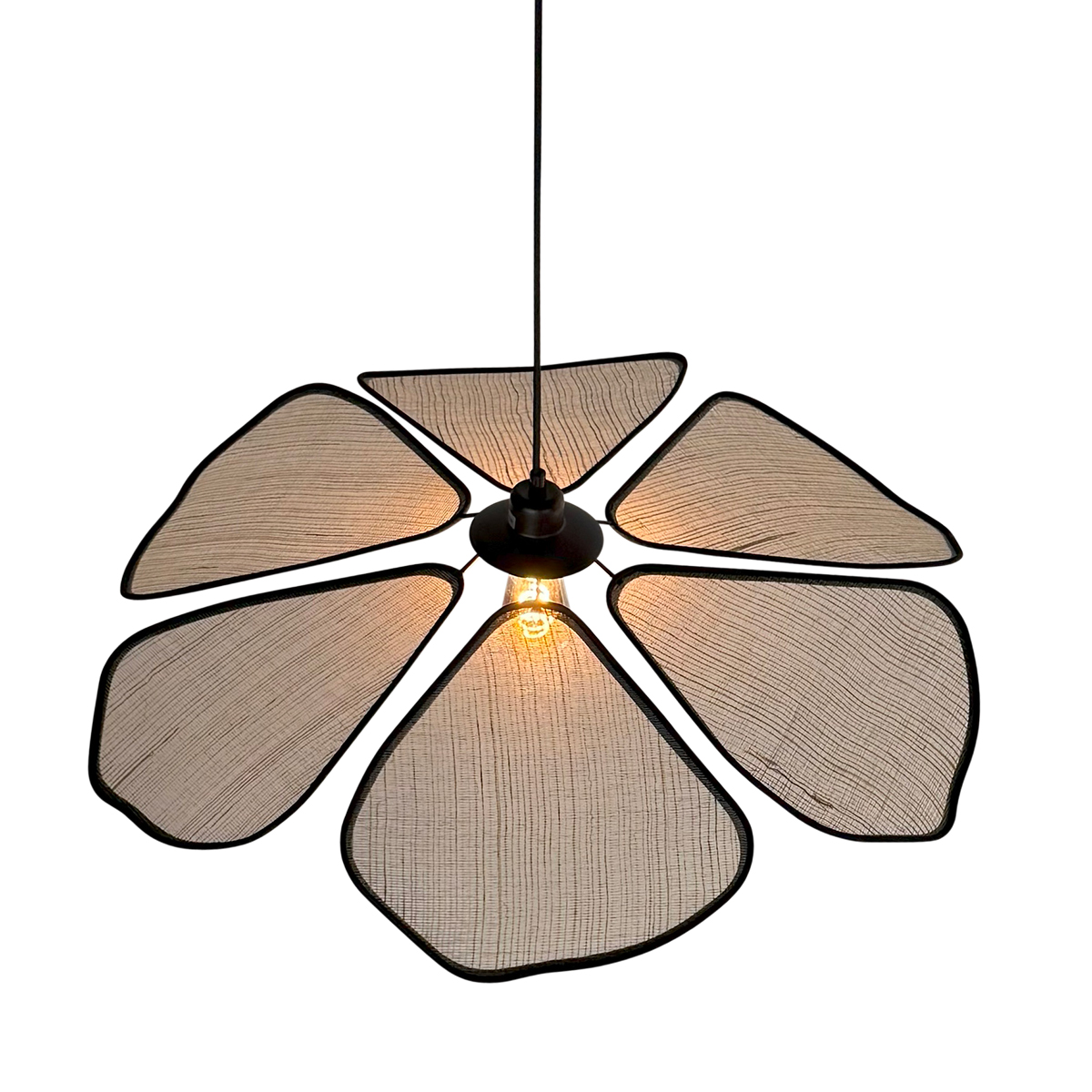 De LumaFlora hanglamp heeft een unieke bloemvorm met zes linnen bladeren die zacht diffuus licht verspreiden rondom een centrale E27 fitting. Het grijsbruine linnen en het zwarte metalen frame vormen samen een elegante mix van botanisch, Japandi en modern design. De royale diameter maakt deze lamp een echte eyecatcher boven de eettafel of in een ruime woonkamer.