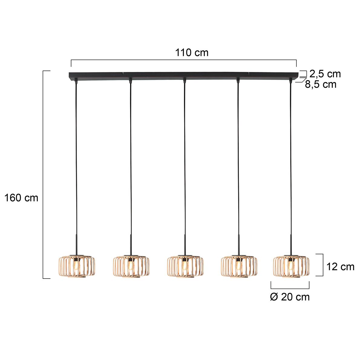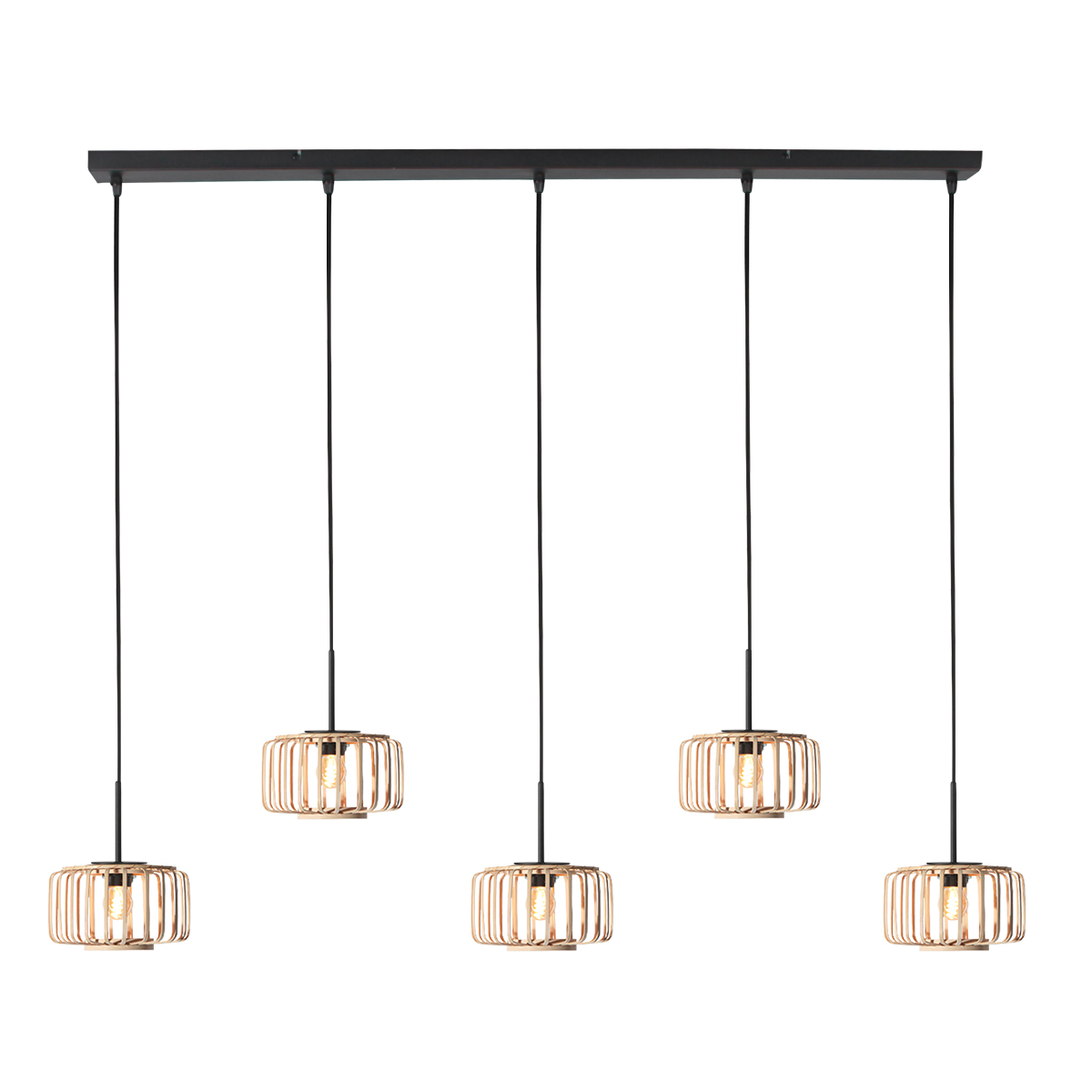 Deze meerlichts HaloSwap hanglamp combineert een zwarte balkpendel met vijf naturel bamboekappen van elk 20 cm. De rechte lijnopstelling zorgt voor een stijlvolle en gelijkmatige verdeling van het licht, perfect boven een eettafel, kookeiland of bar. De natuurlijke bamboekleur geeft de lamp een warme, rustige uitstraling die mooi past in moderne en Scandinavische interieurs.
