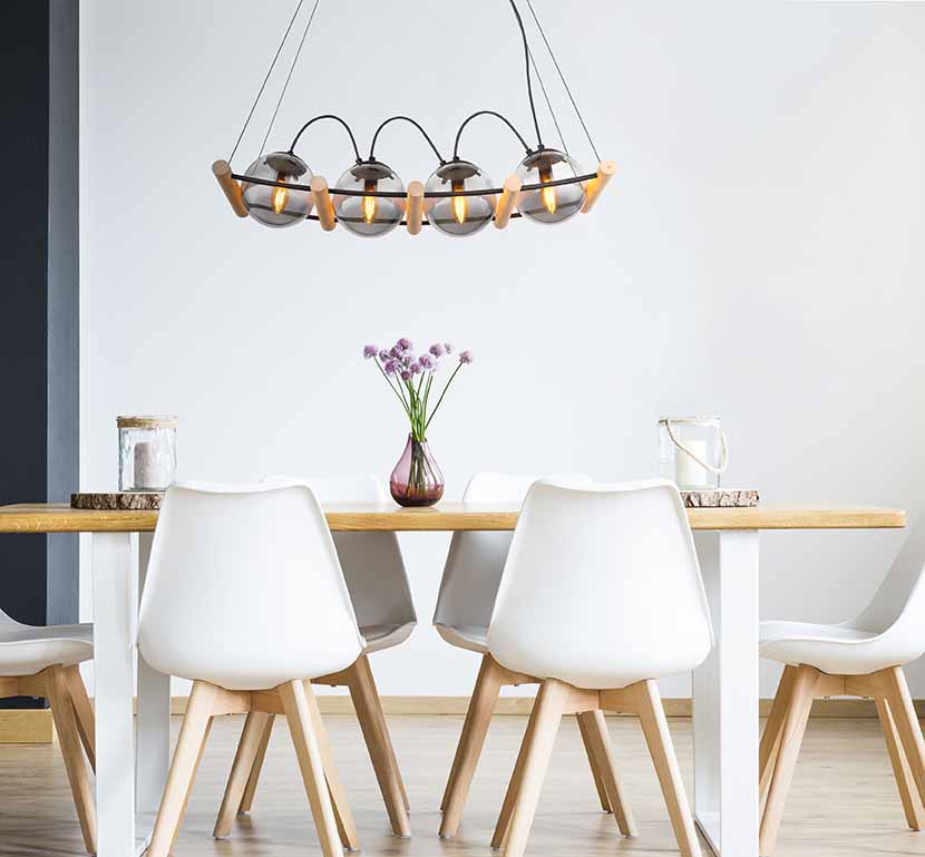Verrijk uw interieur met deze strakke en stijlvolle hanglamp uit de LEONA collectie. Met zijn unieke mix van een zwart metalen frame, rustieke houten accenten en een rookkleurige glazen kap, straalt deze lamp een modern industriële sfeer uit. De lengte van het zwarte PVC-koord kan worden aangepast voor perfecte plaatsing in uw ruimte. De lamp meet 750x220x1200mm en heeft ruimte voor vier E27 15W 230V lampen, welke niet meegeleverd worden bij de aankoop.