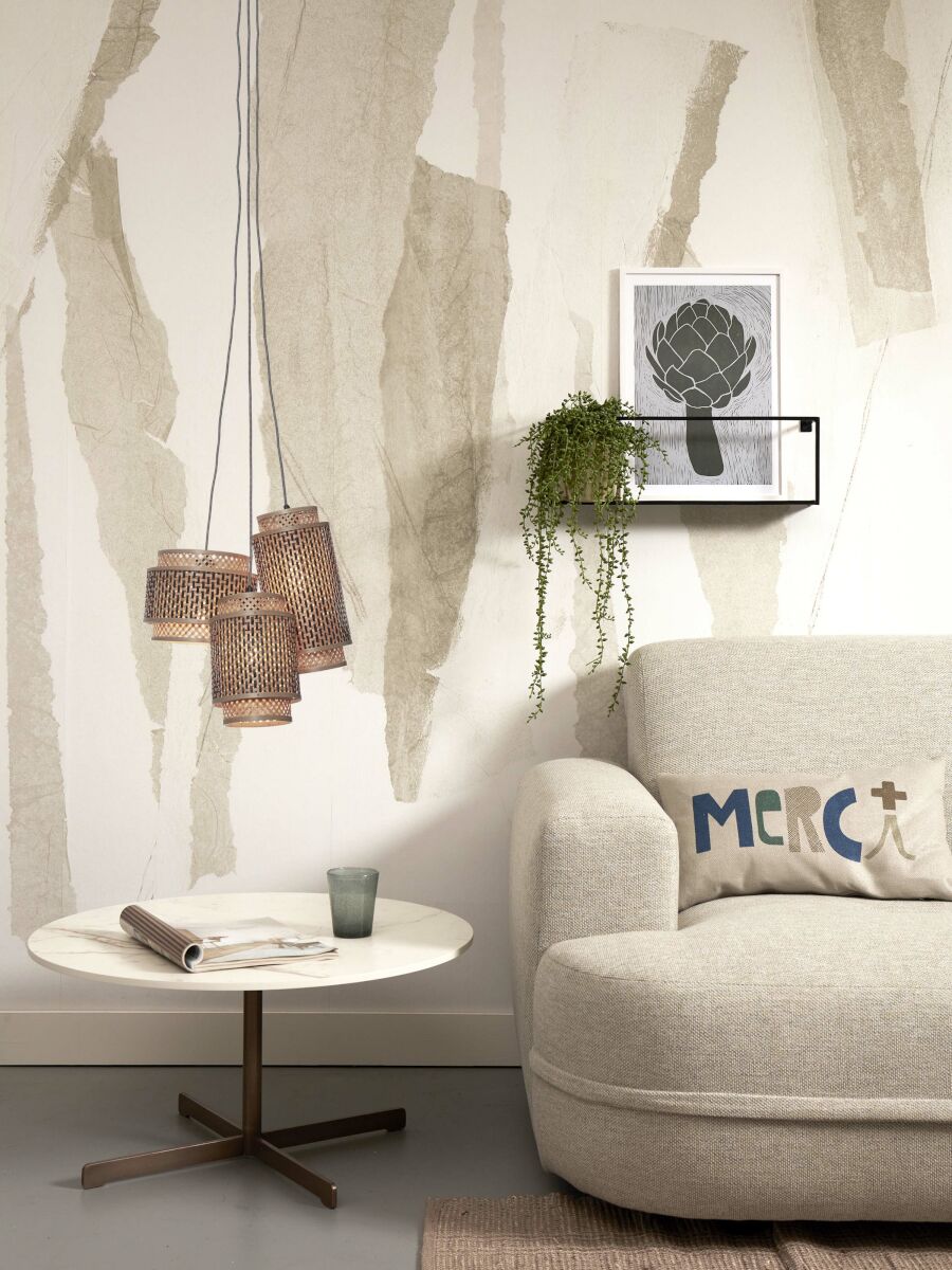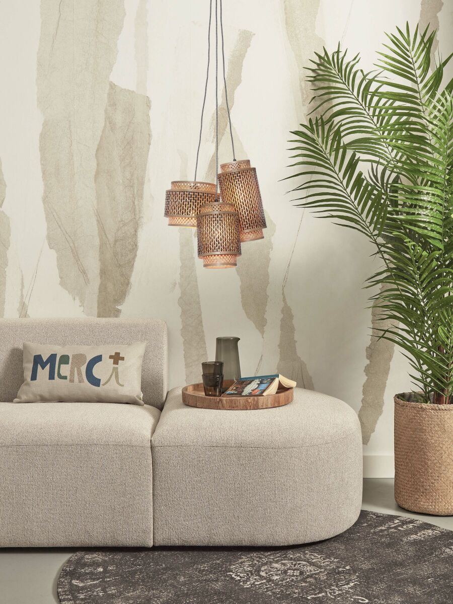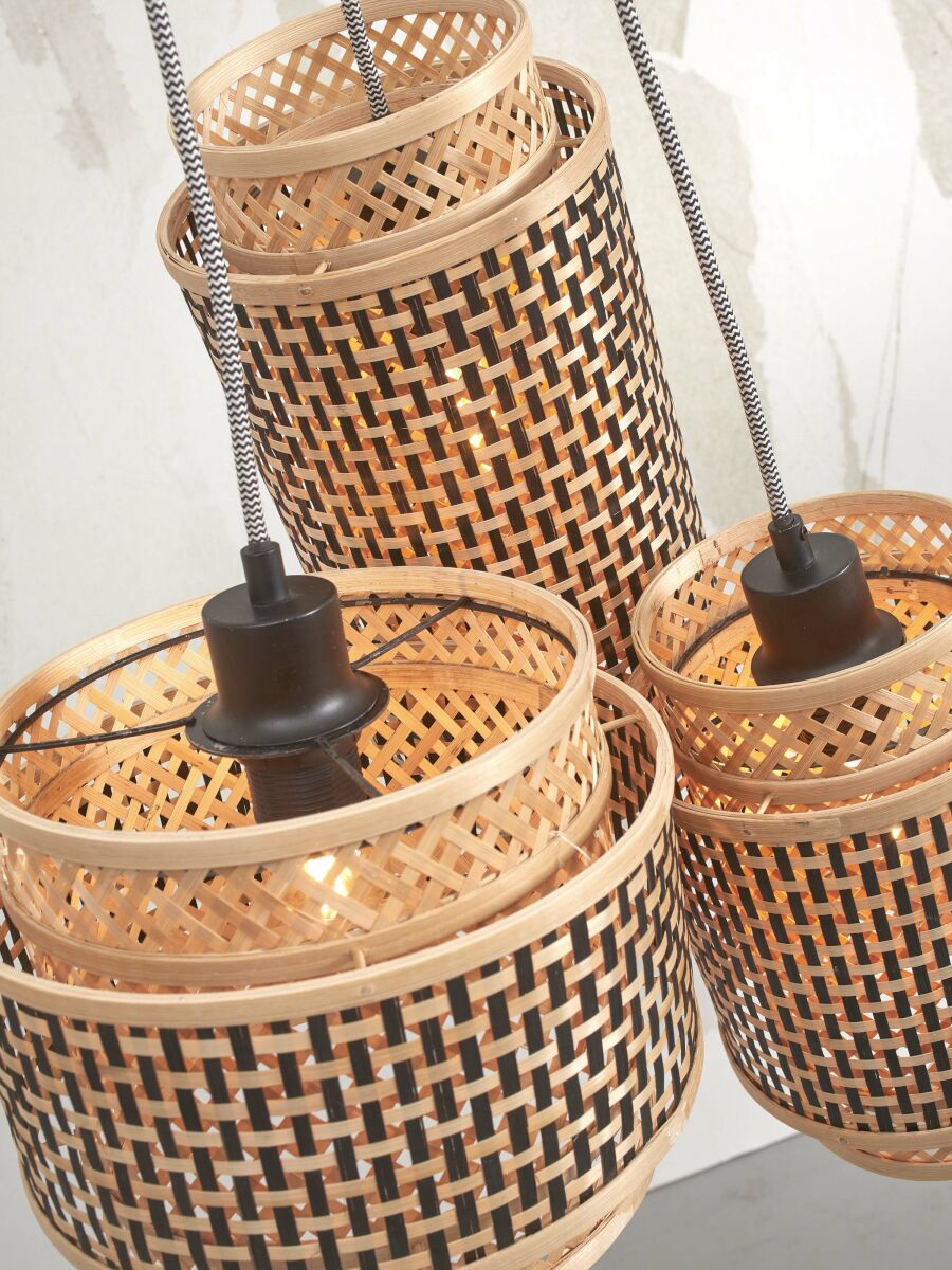 De hanglamp Bhutan met drie lichtpunten, gemaakt van bamboe en metaal, voegt een elegante bohemian flair toe aan je eetkamer of hal. Deze lamp in naturel en zwart biedt een organische uitstraling. Voorzien van een E27 fitting en IP20 bescherming, ideaal voor sfeervolle verlichting.