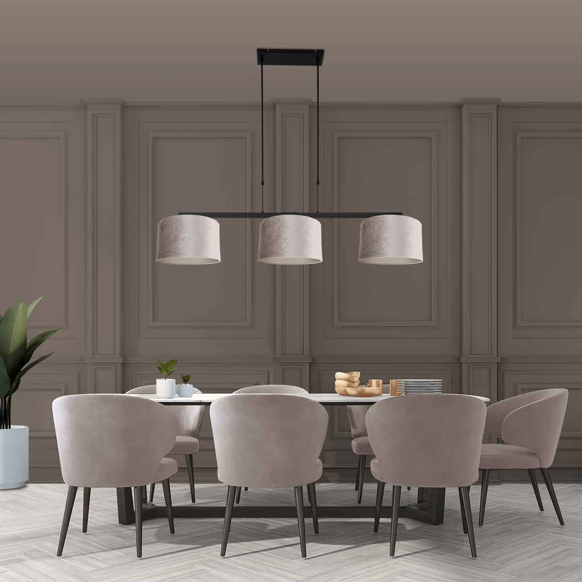 De drie grijze velours kappen van 30 cm geven de lamp een chique uitstraling die zich moeiteloos in moderne interieurs voegt. Deze lamp is een perfecte keuze voor wie op zoek is naar een elegante en eigentijdse verlichting. Deze hanglamp wordt geleverd met 2 jaar garantie.