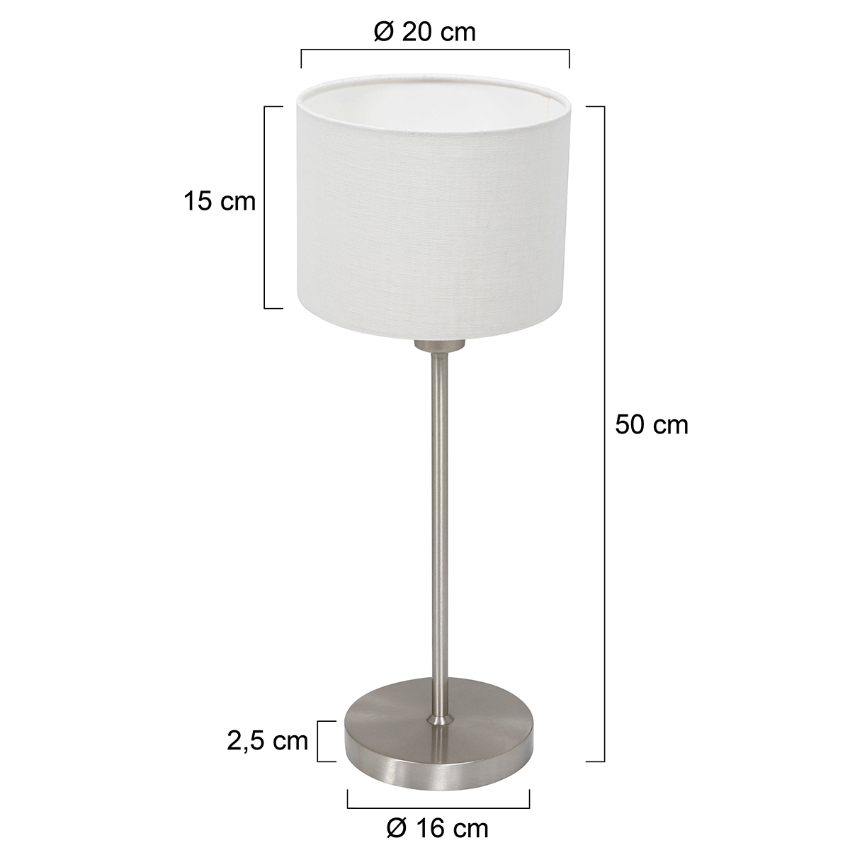 Deze tafellamp is met zijn totale hoogte van 50 cm een elegante aanvulling voor elk dressoir, nachtkastje of bijzettafel. Het armatuur is gemaakt van geborsteld staal en heeft een moderne, tijdloze uitstraling. De witte linnen kap heeft een ronde vorm met een diameter van 20 cm en zorgt voor een zachte, natuurlijke lichtverspreiding die rust brengt in de ruimte. Deze combinatie van materialen straalt eenvoud, frisheid en verfijning uit – perfect voor een licht en eigentijds interieur.