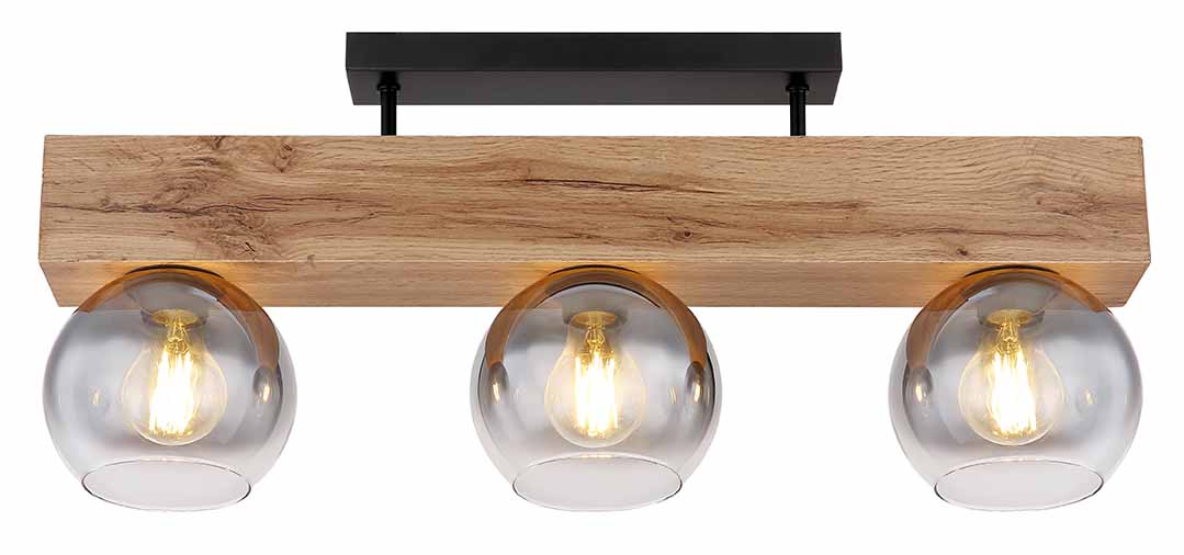 Deze prachtige plafondlamp uit de MOITAS-serie inspireert met een geweldig design. Twee korte metalen staven steken uit een rechthoekige zwarte plafondbevestiging naar een blok in houtlook (65x15cm). Er zijn drie E27-stopcontacten, elk met een glazen kap in rookkleuren. Met de E27-aansluitingen kunt u zelf de lichtkleur en helderheid bepalen tot een maximaal vermogen van 40 watt.