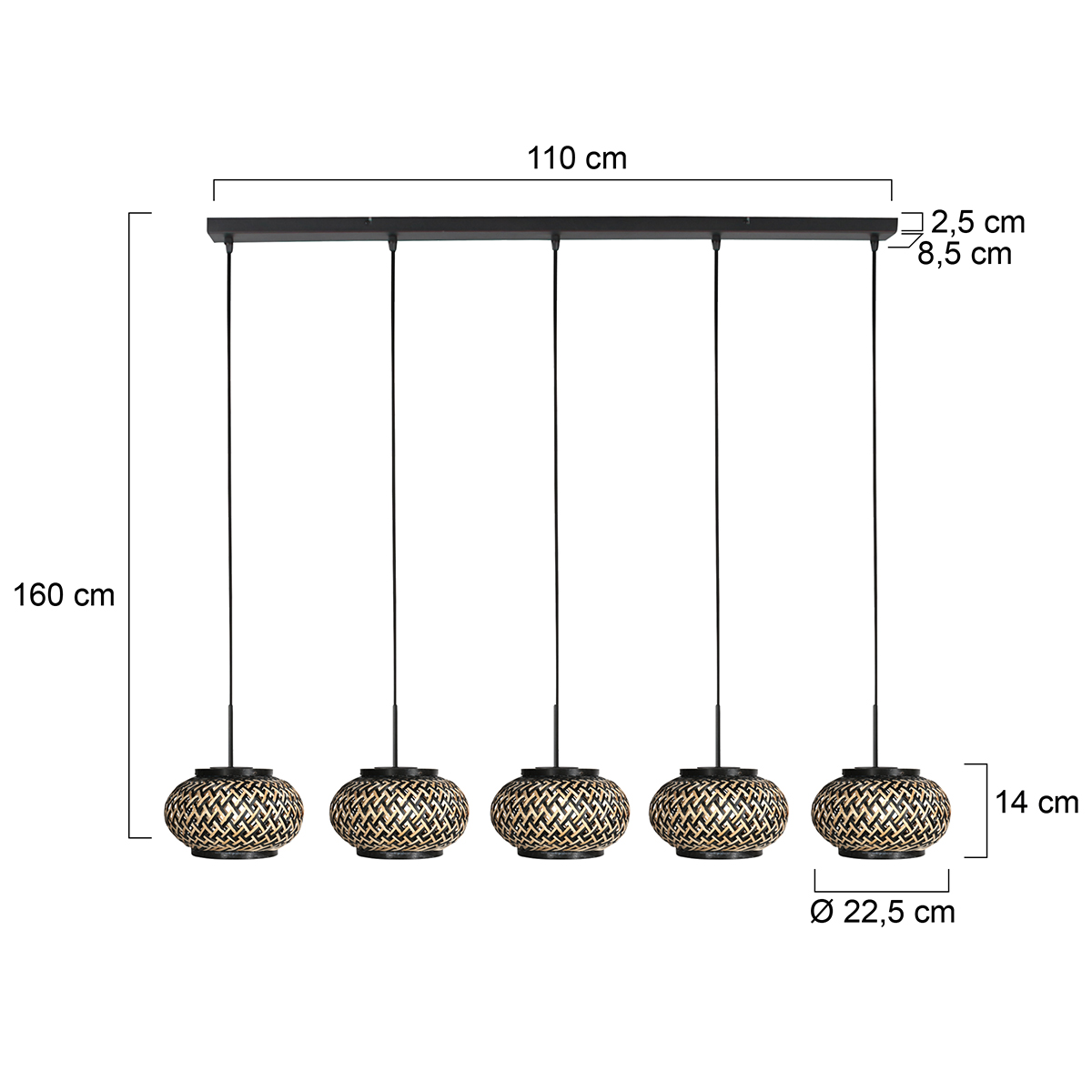 Deze langwerpige zwarte hanglamp met vijf lichtpunten wordt hier gecombineerd met vijf compacte bamboekappen en is bij uitstek geschikt voor boven een eettafel of kookeiland. De armatuur heeft vijf E27 fittingen, elk aan een stevig strijkijzersnoer met een maximale lengte van ongeveer 140 centimeter. Zo kun je de lichtpunten gelijkmatig verspreiden of juist speels in hoogte variëren. De langwerpige plafondplaat van circa 110 bij 8,5 centimeter oogt strak en modern en is eenvoudig te monteren.