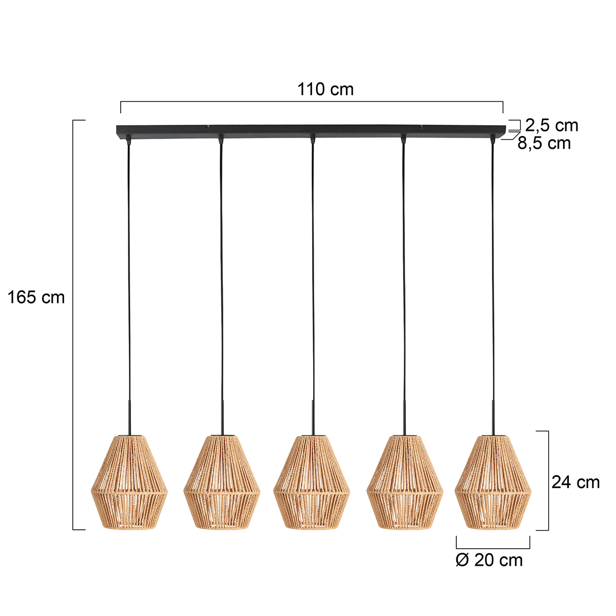 Deze langwerpige zwarte hanglamp met vijf lichtpunten wordt hier gecombineerd met vijf hoge touwlampenkappen, waardoor een speelse en toch elegante lichtlijn boven je eettafel of kookeiland ontstaat. De armatuur is voorzien van vijf E27 fittingen aan stevige strijkijzersnoeren van maximaal 140 centimeter, zodat je de hoogte van elke kap afzonderlijk kunt instellen. De smalle plafondplaat van ongeveer 110 bij 8,5 bij 2,5 centimeter oogt strak en modern en verdeelt de lichtpunten mooi over de ruimte.
