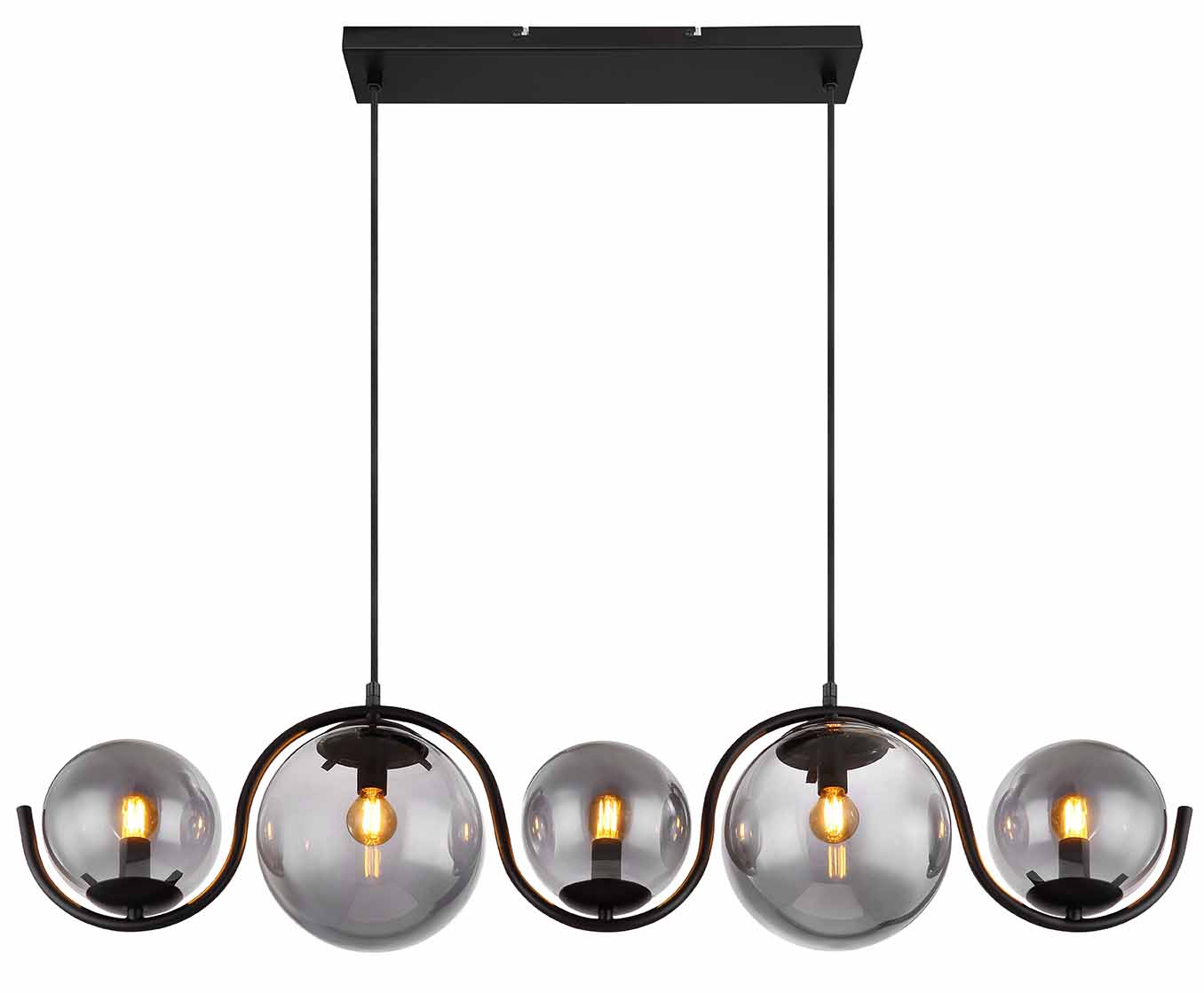 Ervaar de verfijnde stijl van deze buitengewone plafondlamp. Vanuit een slank bevestigingspunt, verlengen twee matzwarte kabels zich tot 1,2 meter, culminerend in een S-vormig metalen frame dat vijf E14-fittingen huisvest. Deze omvatten prachtig gevormde rookglas lampenkappen, waardoor u de kracht hebt om lichtkleur en helderheid tot een capaciteit van 25 watt naar eigen smaak te reguleren. Vanwege de uitstekende duurzaamheid en energiezuinigheid, is het gebruik van LED-lampen aanbevolen.