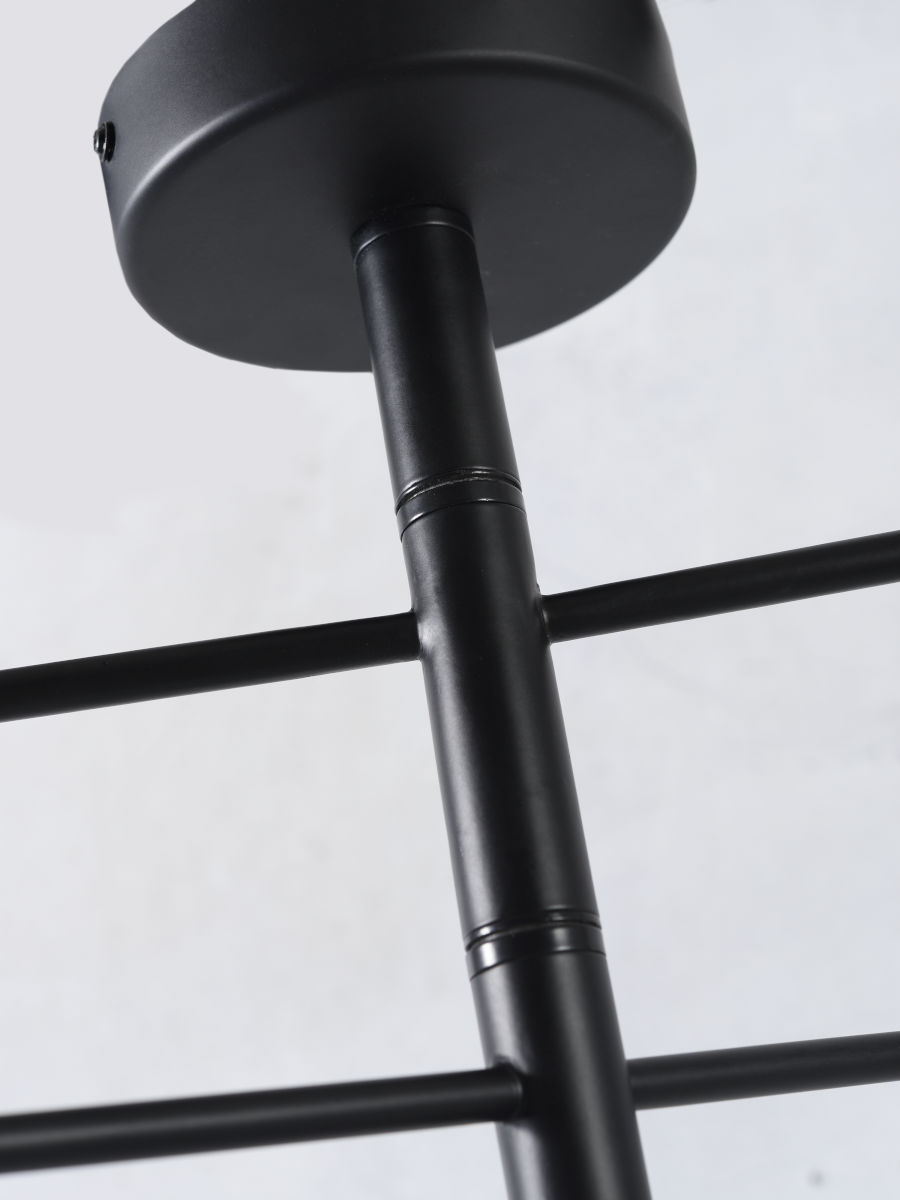 Retro plafonnière van zwart metaal, ideaal voor de eetkamer. Voorzien van zes kleine E14 fittingen en stofdicht (IP20). Deze lamp voegt een klassieke en elegante uitstraling toe aan je interieur. Het metalen ontwerp straalt een tijdloze charme uit, perfect om een stijlvolle en verfijnde eetomgeving te creëren. Deze lamp zorgt voor een optimale verlichting met een retro touch.