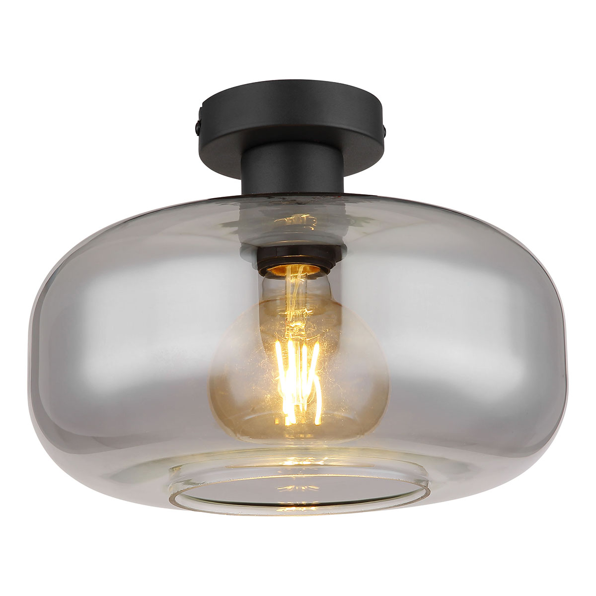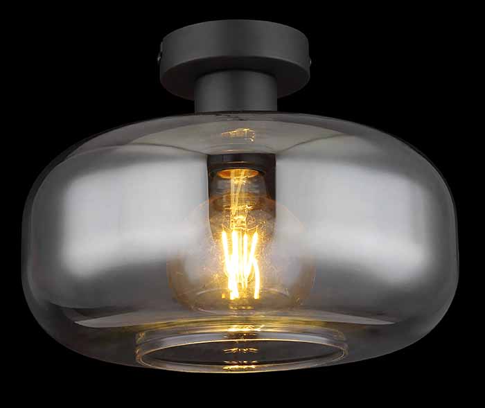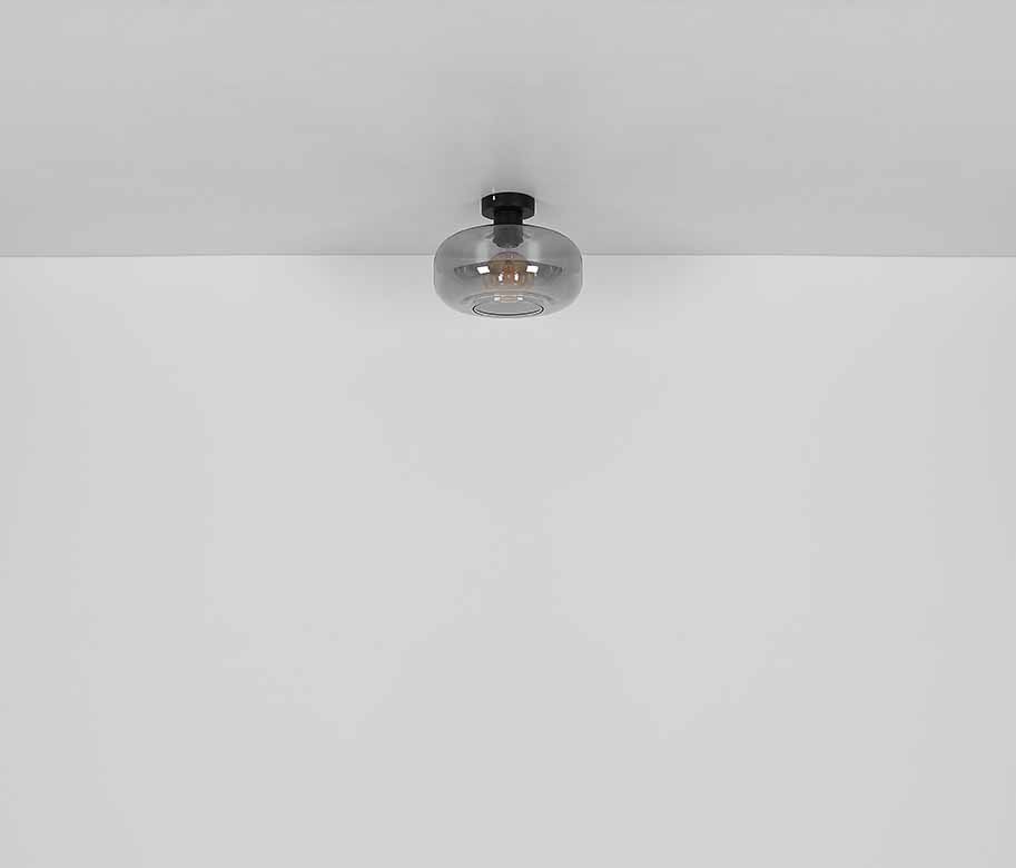 Ontdek deze moderne plafondlamp met een ronde, zwarte bevestiging en een E27-fitting, afgedekt door een stijlvolle rookkleurige glazen kap (Ø28 cm). Pas de lichtkleur en helderheid aan naar uw behoefte tot een maximum van 40 watt. LED-lampen zijn aanbevolen voor efficiëntie en lange levensduur.