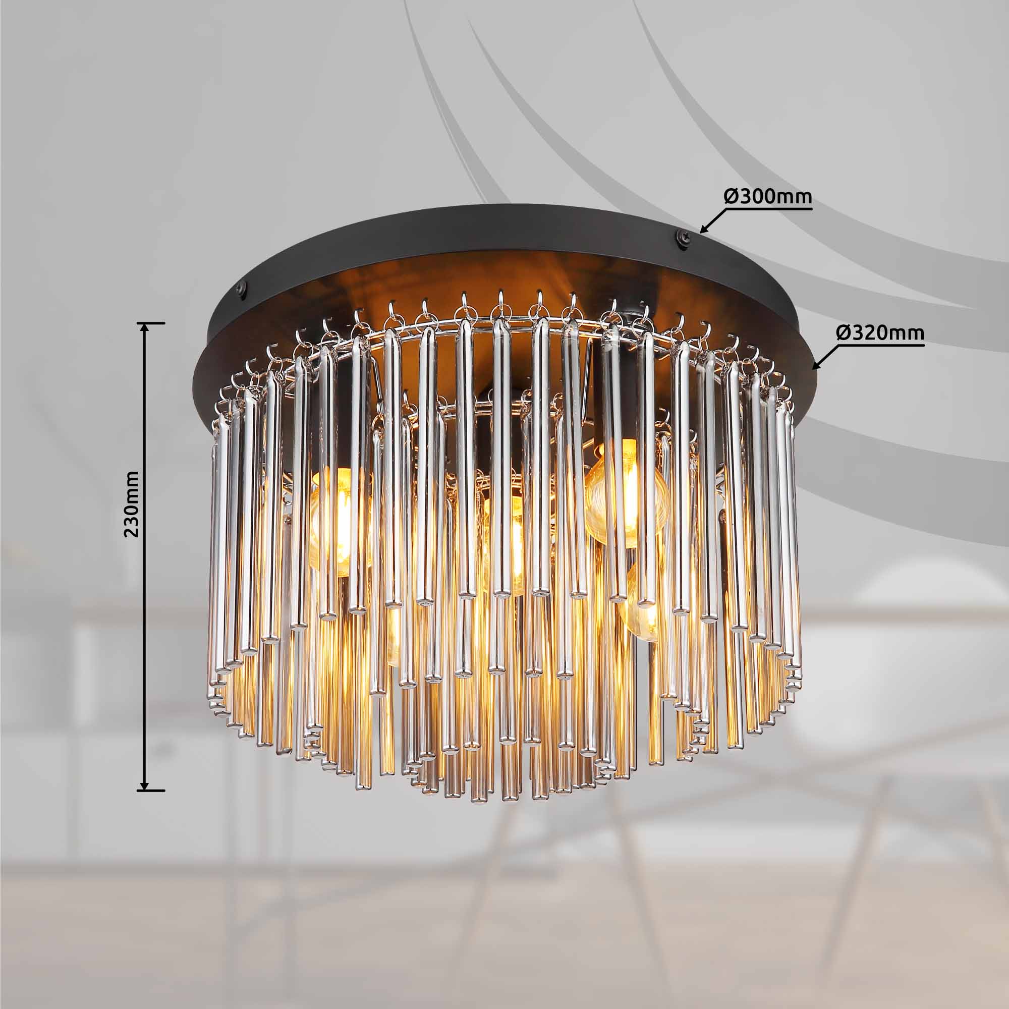Ontdek de elegante GORLEY plafondlamp! Het ontwerp maakt indruk met de combinatie van matzwart metaal, glanzend chroom en rookkleurige glazen staven. Deze unieke combinatie voegt een vleugje verfijning en stijl toe aan uw ruimte. Met een diameter van 320 mm en een hoogte van 230 mm past de GORLEY perfect in verschillende ruimtes. Met de E14-stopcontacten kunt u zelf de lichtkleur en helderheid bepalen tot een maximaal vermogen van 40 watt. Laat je fantasie de vrije loop en kies de juiste bollen om de sfeer te creëren die je wilt. Haal uniek design en aangenaam licht in huis met de GORLEY plafondlamp!