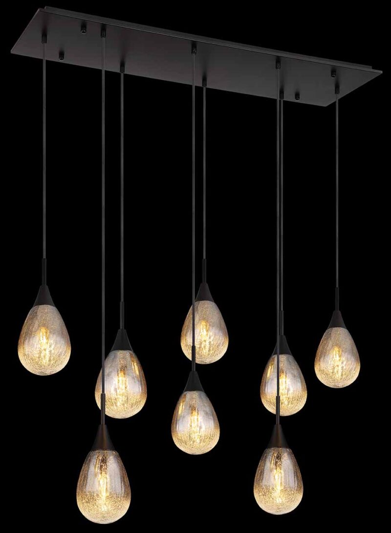 Deze indrukwekkende hanglamp uit de KRYS-serie heeft een zwarte matte rechthoekige plafondbevestiging (97 x 34 cm) waaruit acht kabels van verschillende lengtes tot 1,2 m naar beneden lopen, elk met een E14-aansluiting voorzien van rookkleurige glaskappen. De lichtkleur en helderheid zijn aanpasbaar tot 9 watt. LED-lampen worden aanbevolen.