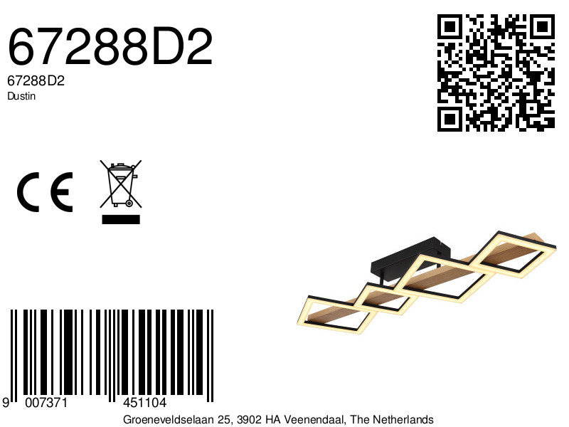 Werk uw interieur bij met de stijlvolle plafondlamp uit de DUSTIN serie. Met een understated zwarte matte afwerking en donker MDF houtlook design, zorgt dit voor een elegant contrast van materialen. De lamp heeft afmetingen van 920 mm x 300 mm x 130 mm en maakt gebruik van een 35W LED-lichtbron die met een kleurtemperatuur van 3000K een helder wit licht van 3700lm produceert. Toegevoegd is een unieke opaal kunststof hoes, onderverdeeld in zowel kleine als grote vierkanten, die bijdragen aan de esthetische aantrekkingskracht. De bevestiging is eenvoudig met een duurzame zwarte ABS lampvoet.