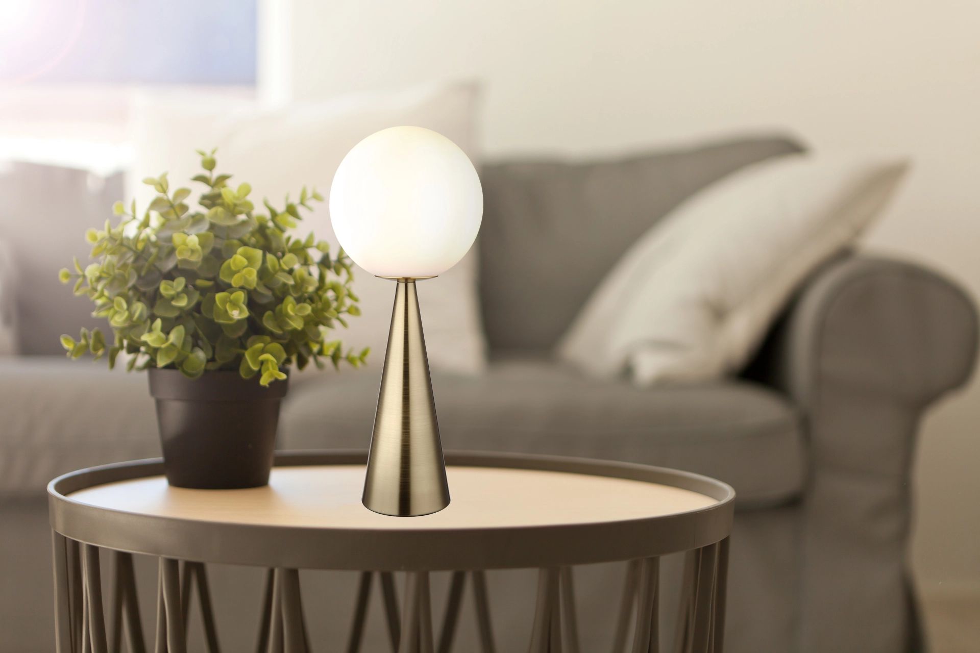 Deze elegante conische tafellamp is een waar pronkstuk dankzij zijn moderne ontwerp en hoogwaardige afwerking. Het conische lichaam is gemaakt van mat messingkleurig metaal, wat de lamp een luxe uitstraling verleent. De opaalwitte glazen bol als lampenkap zorgt voor een aangename en verblindingsvrije verlichting. Met een diameter van 20 centimeter en een vermogen van 40 watt biedt deze lamp voldoende licht voor diverse toepassingen, zodat hij in elk interieur tot zijn recht komt.
