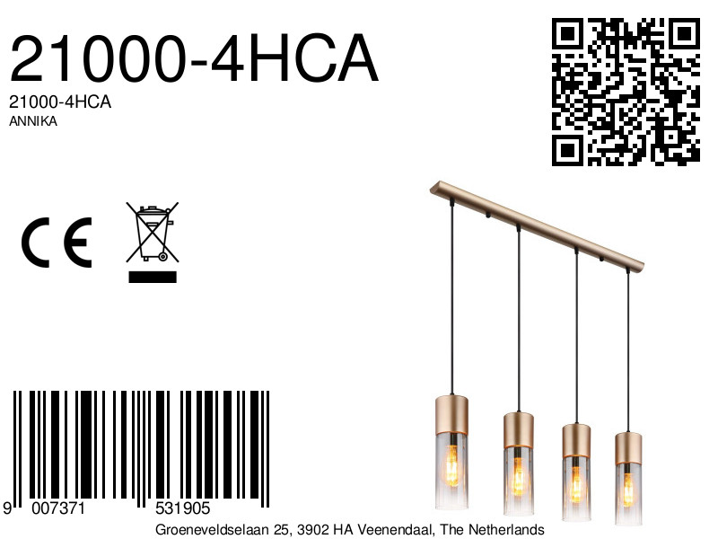 De E27 lampvoet, die niet inbegrepen is, geeft u de vrijheid om een lamp naar keuze te selecteren, zodat u de lichtsfeer naar eigen wens kunt aanpassen. De ANNIKA hanglamp biedt een eigentijdse verlichtingoplossing die indruk maakt met zijn eenvoudige en moderne ontwerp. Dit maakt het een waardevolle aanvulling voor iedere woning die stijlvolle accenten wil toevoegen aan het interieur.