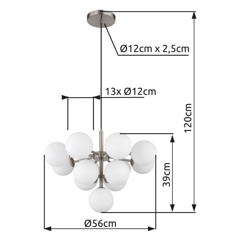 De hanglamp Grappy is een moderne hanglamp die eenvoud en elegantie perfect weet te combineren met een vleugje extravagantie. Deze lamp heeft een matte nikkel afwerking en opale glazen bollen, wat zorgt voor een stijlvol en tijdloos design. Met een diameter van 560 mm en 13 geïntegreerde G9 LED-lampen biedt deze hanglamp zowel aangename als heldere verlichting voor uw woonruimte. De LED-lampen, elk met een vermogen van 5W, garanderen een efficiënte lichtopbrengst en creëren een sfeervolle ambiance.