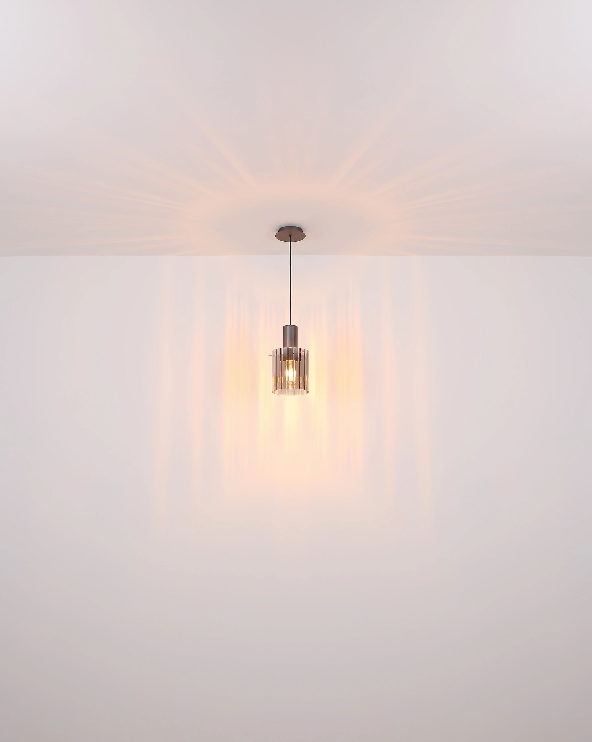Deze stijlvolle en moderne hanglamp met een donkergrijs metalen pendel is de ideale verlichting voor jouw huis. De ronde, cilindervormige glazen kap met een rookkleurige uitstraling is versierd met elegante groeven, wat de lamp een verfijnde look geeft. Deze structuur zorgt voor een aangename en gelijkmatige lichtverspreiding. Met een diameter van 180 mm biedt de kap plaats aan een E27-lamp tot 40 watt, waardoor je voldoende keuzemogelijkheden hebt voor jouw favoriete verlichting.