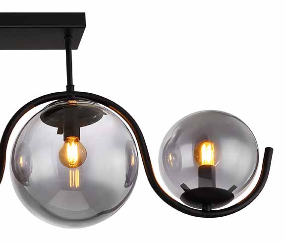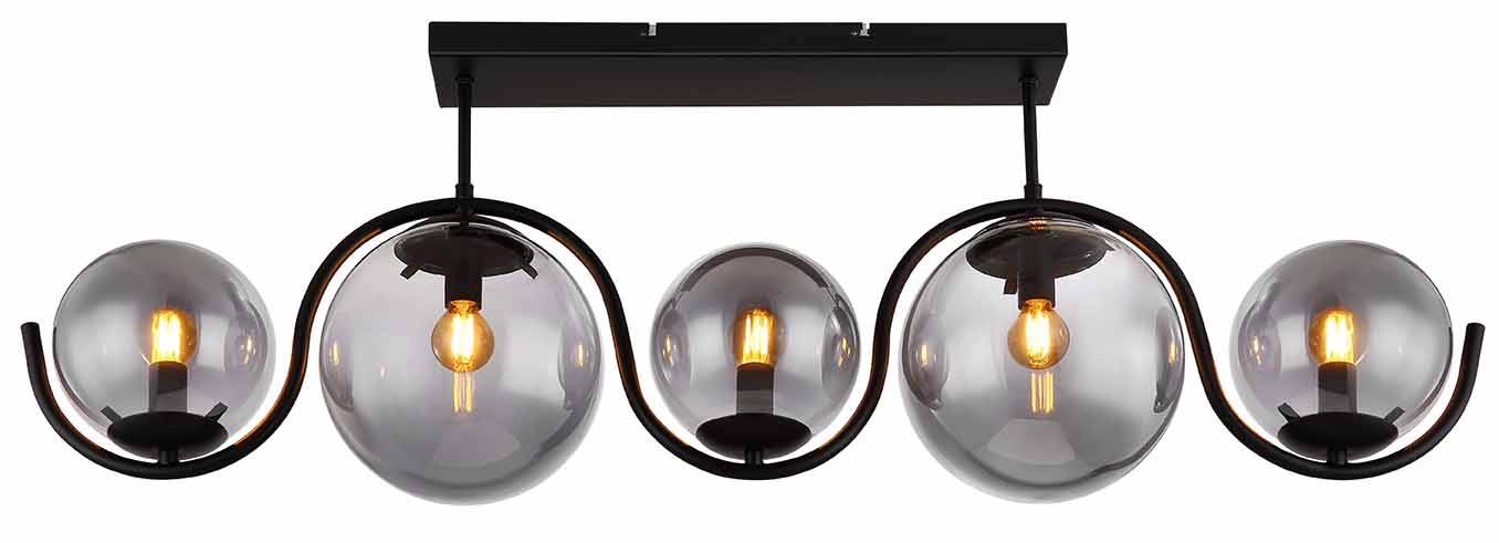 Deze unieke plafondlamp is een verbluffende mix van stijl en functionaliteit. De montage aan het plafond is smal, met twee elegante matte zwarte palen die overgaan in een S-vormige metalen staaf. Bovenop deze staaf bevinden zich vijf E14-stopcontacten, elk omgeven door prachtige rookkleurige glazen tinten. Pas de helderheid en kleur van het licht aan tot 25 watt met deze E14-aansluitingen. Door de energie-efficiëntie en levensduur zijn LED-lampen de aanbevolen lichtbron.