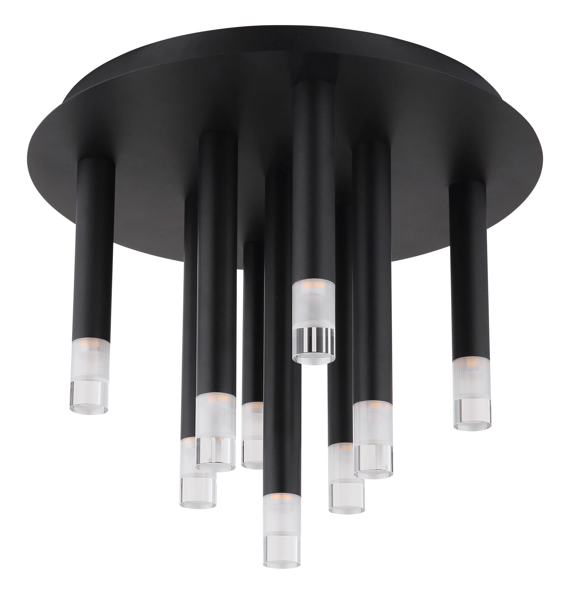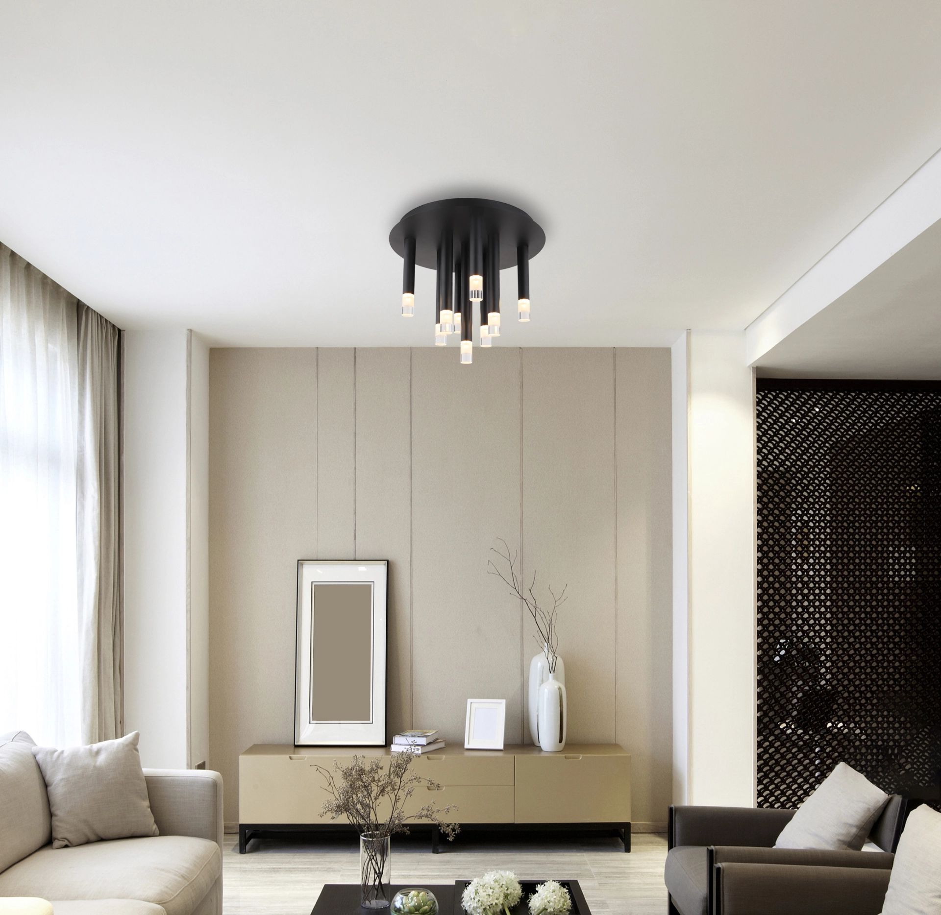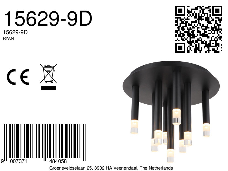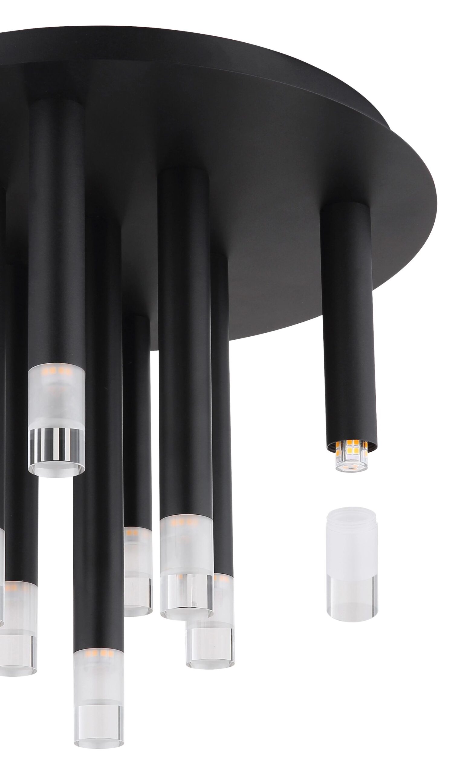 De RYAN plafondlamp onderscheidt zich door zijn moderne en elegante ontwerp. Met een ronde behuizing van mat zwart metaal voegt deze lamp een stijlvolle elementen toe aan elke ruimte. De negen slanke cilindrische lampenschermen, gemaakt van mat zwart metaal en afgewerkt met satijn en helder acryl, zorgen voor een aangename en gelijkmatige verlichting. Dankzij een diameter van 340 mm is de RYAN veelzijdig inzetbaar en biedt het de ideale verlichtingsoplossing voor verschillende kamergroottes.