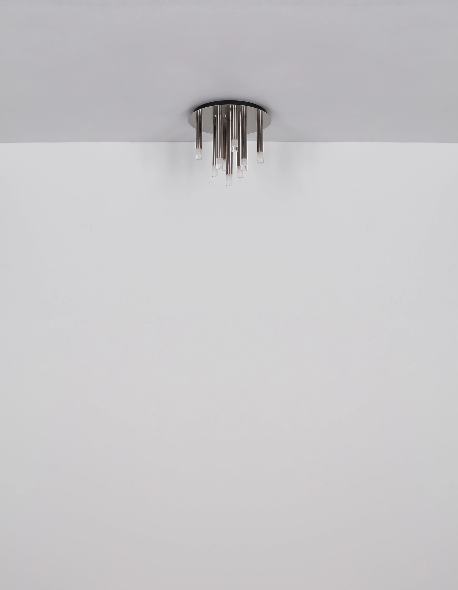 De RYAN plafondlamp valt op door zijn moderne ontwerp en praktische functionaliteit. Het ronde lichaam van mat nikkel zorgt voor een elegante uitstraling, terwijl de negen slanke, cilindrische kappen van mat nikkel en satijnachtig helder acryl zorgen voor een gelijkmatige verspreiding van licht. De kappen zijn harmonieus in een ronde opstelling gerangschikt, wat de lamp een esthetisch aantrekkelijke uitstraling geeft.