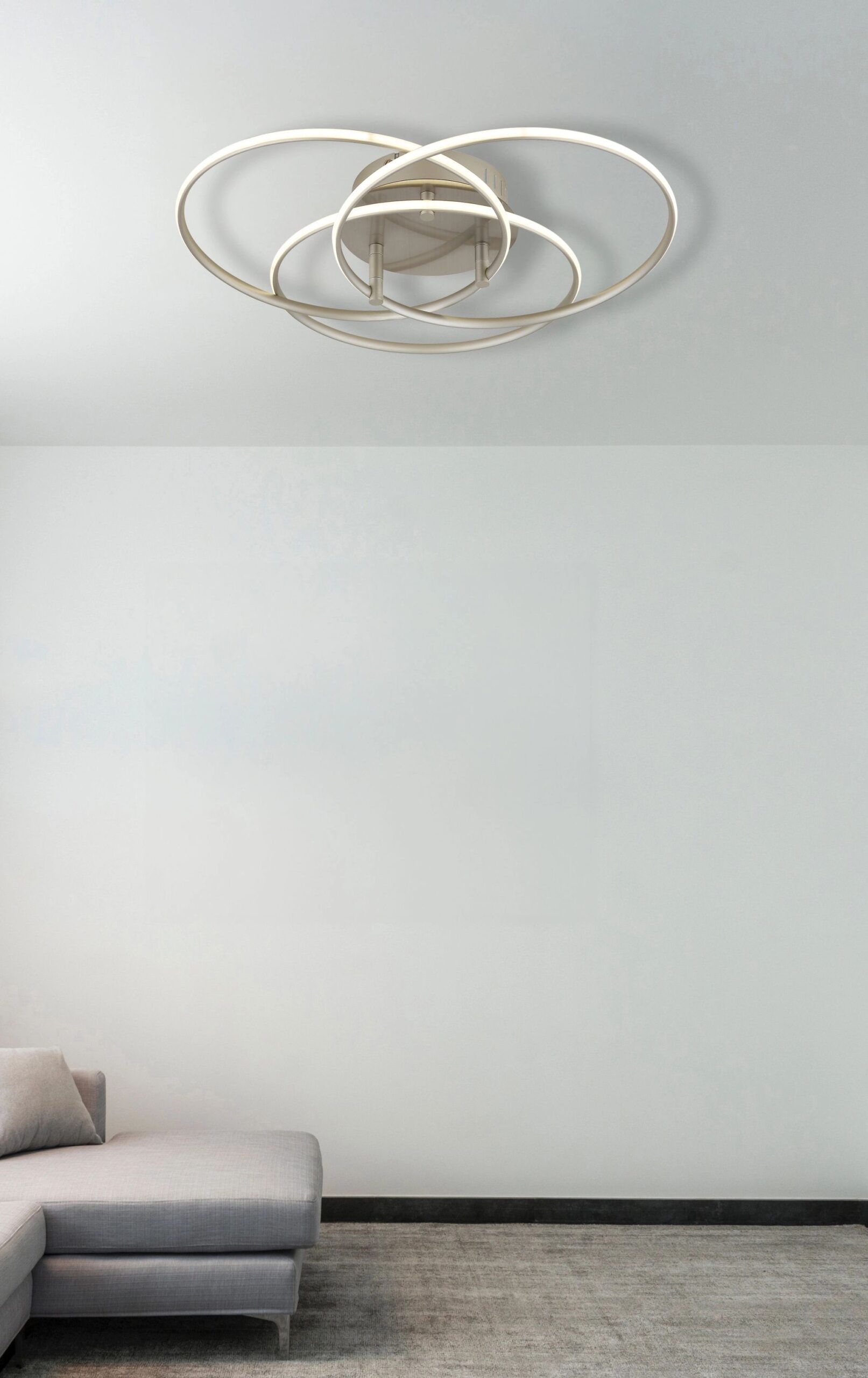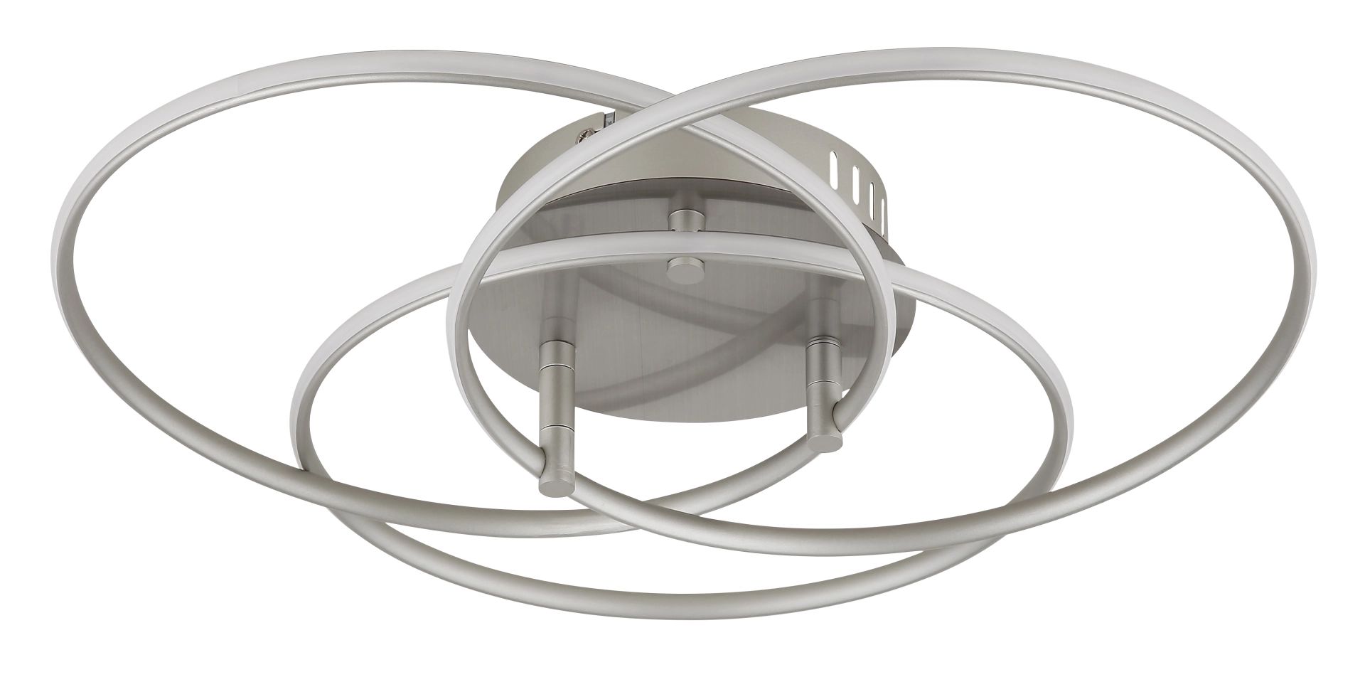 De KOMBOS plafondlamp is de ideale samensmelting van modern design en krachtige verlichting. Deze bijzondere lamp bestaat uit drie elegant gestapelde ringen, die samen een harmonieus en circulair geheel vormen. Met een stijlvolle afwerking in matte nikkel en een lampenkap van aluminium, gecombineerd met mat nikkel en opaalplastic, straalt de lamp een eigentijdse en verfijnde uitstraling uit. Met een diameter van 456 mm is de KOMBOS plafondlamp perfect geschikt voor diverse kamerformaten.