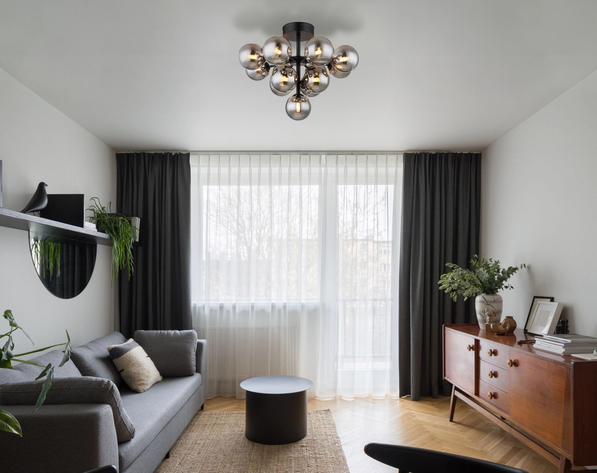 De ronde plafondlamp Grappu is de perfecte aanvulling voor elke kamer en biedt een moderne en stijlvolle lichtoplossing. Deze lamp, vervaardigd uit zwart mat gelakt metaal en voorzien van rookkleurige glazen bollen, creëert een uniek lichtspel dat uw interieur een bijzondere sfeer geeft. Met zijn elegante combinatie van materialen past de plafondlamp moeiteloos in diverse omgevingen. Met een diameter van 560 mm en 13 G9 LED-lampen met een vermogen van 5W, zorgt deze lamp voor een aangename en sfeervolle verlichting in uw woon- of eetkamer.