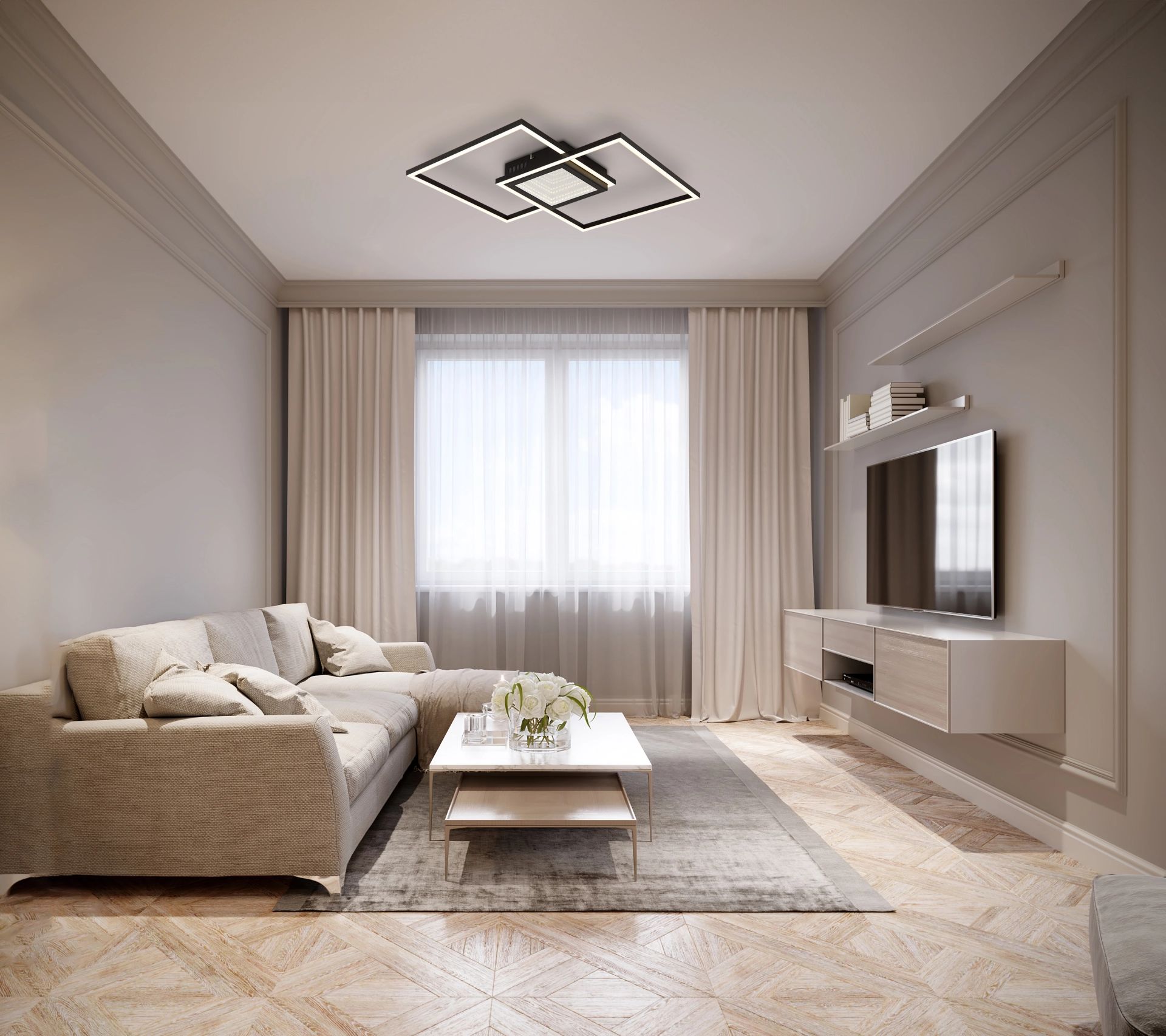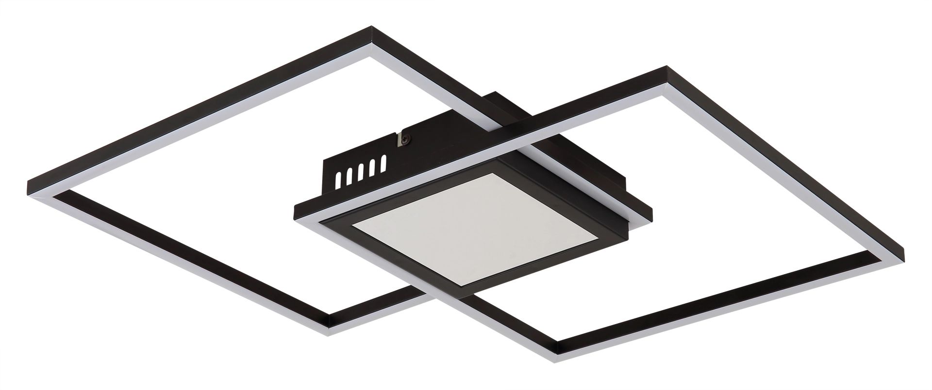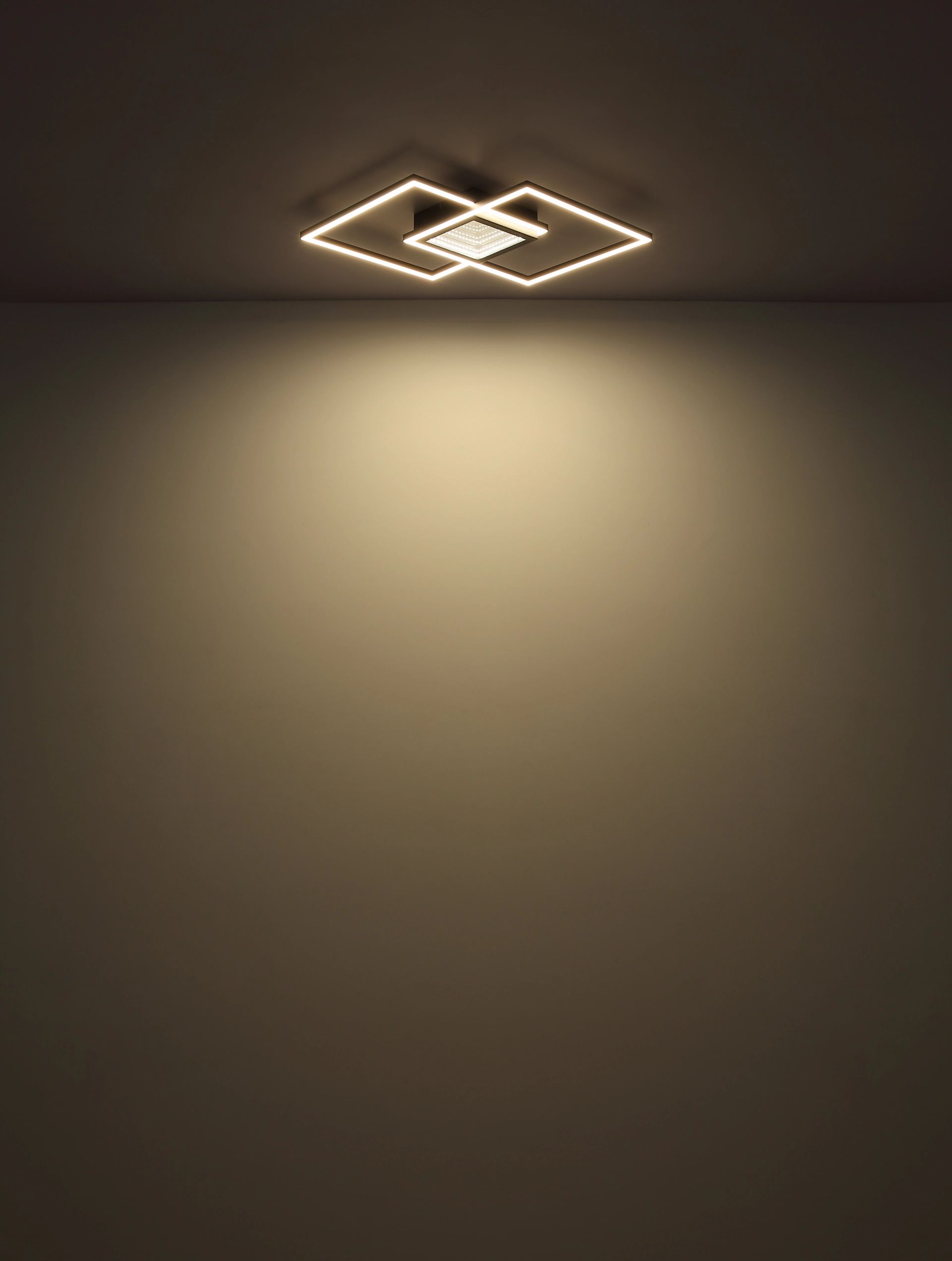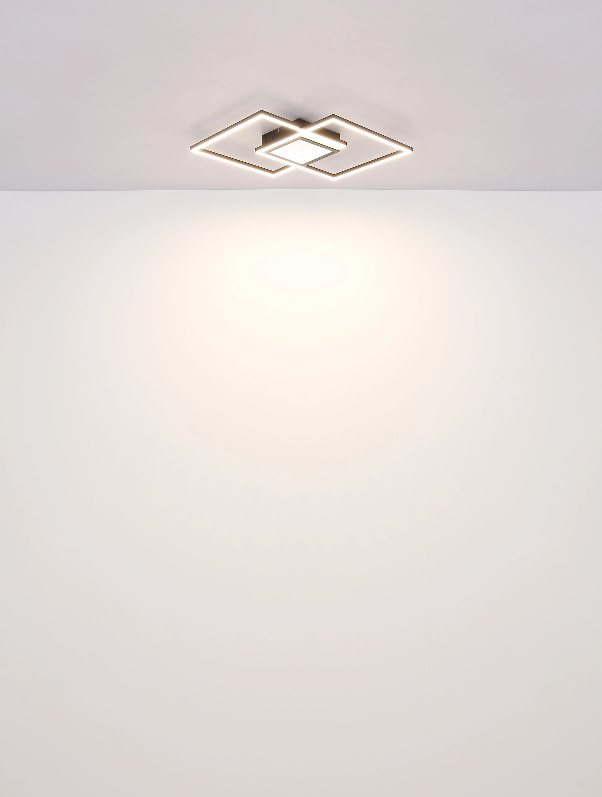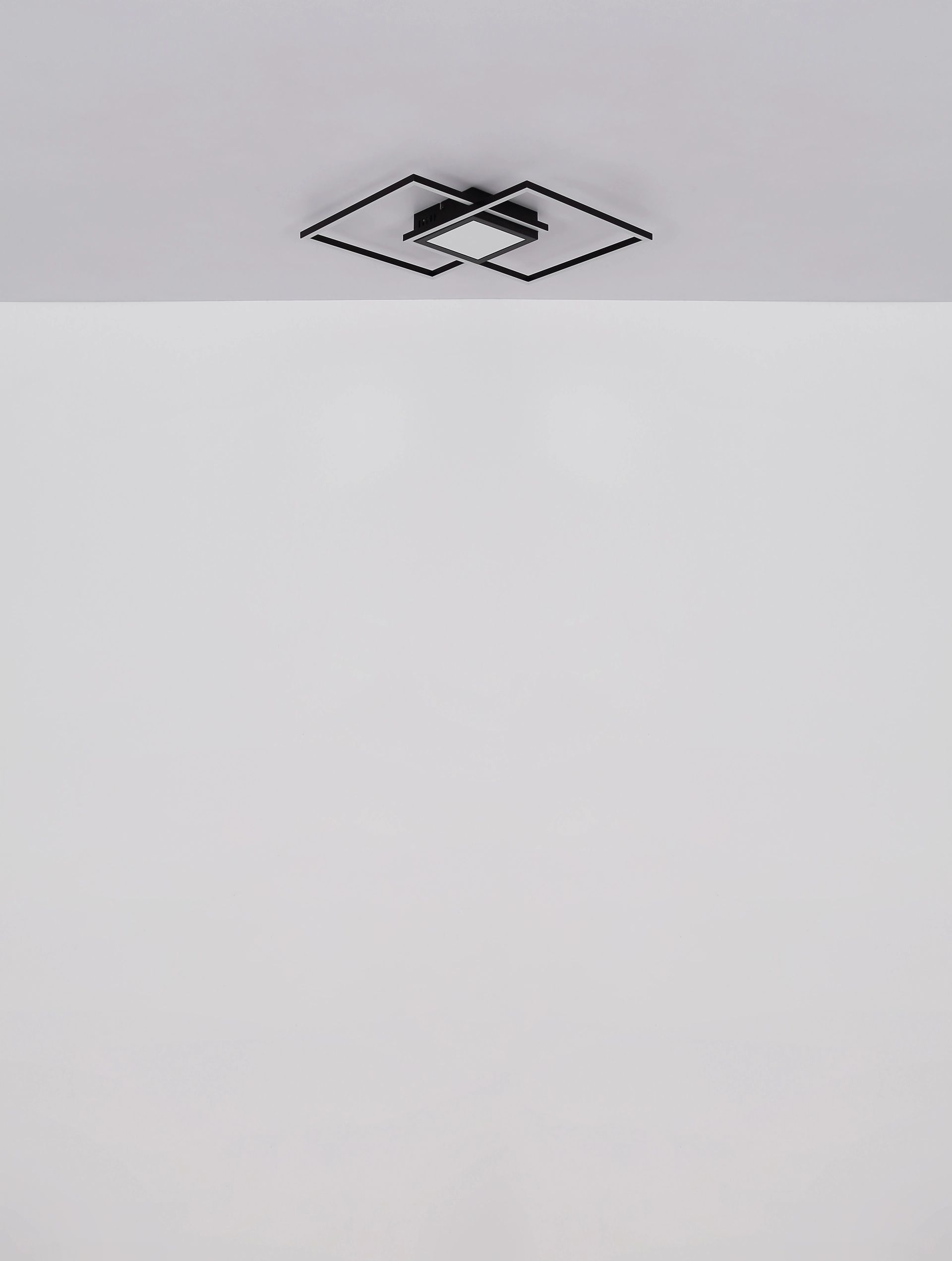 De YRDIS plafondlamp combineert stijl met functionaliteit dankzij zijn unieke vierkante ontwerp, dat bestaat uit twee verspringende vierkanten die op elkaar zijn gestapeld. Het strakke zwarte metalen frame in combinatie met de mat zwarte aluminium lampenkap en opaal kunststof zorgt voor een indrukwekkend 3D-effect dat elke ruimte een moderne uitstraling geeft. Met een lichtopbrengst van 1874 lumen en een instelbare kleurtemperatuur van 2700K tot 6500K kun je de verlichting eenvoudig afstemmen op jouw wensen en stemming.