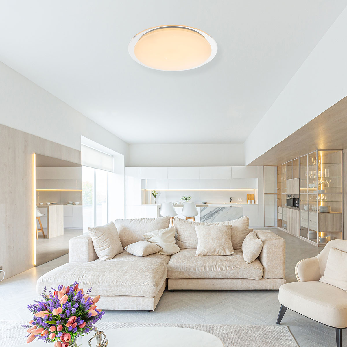 Laat uw interieur stralen met deze unieke, doch eenvoudige plafondlamp uit de Optima-serie. Gemaakt van wit metaal als basis en verfijnd met satijn plastic, acryl en sprankelend decor, deze verlichtingsoplossing is ideaal voor middelgrote ruimtes dankzij de diameter van 55,5 cm. Licht uw ruimte op met de 5000 lumen sterke lichtbron, variërend van warm licht naar daglicht (3000-6500K), tevens voorzien van een dimfunctie. Deze lamp wordt geleverd met een afstandsbediening en kleurveranderaar met kleurfixatie, een aanvulling op elk modern thuis. Combineer deze lamp met andere verlichtingsoplossingen uit dezelfde serie voor een complete look.