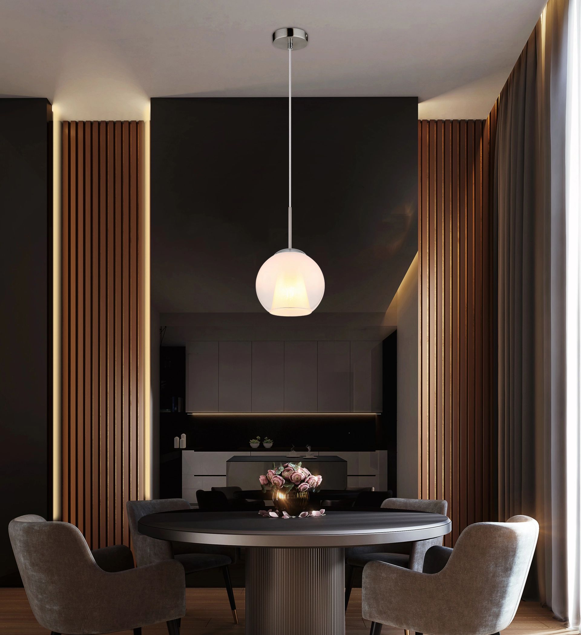 De ronde hanglamp BARRY is een prachtige aanvulling voor elk interieur. Met een elegante glazen bol van 200 mm in diameter voegt deze lamp een moderne touch toe aan uw ruimte. Het ontwerp, gekenmerkt door een body van mat nikkel en verchroomd metaal, straalt contemporane stijl uit. De opale glazen bol met een verfijnd gradiëntontwerp zorgt voor een harmonieuze verspreiding van het licht en creëert een warme en uitnodigende sfeer.
