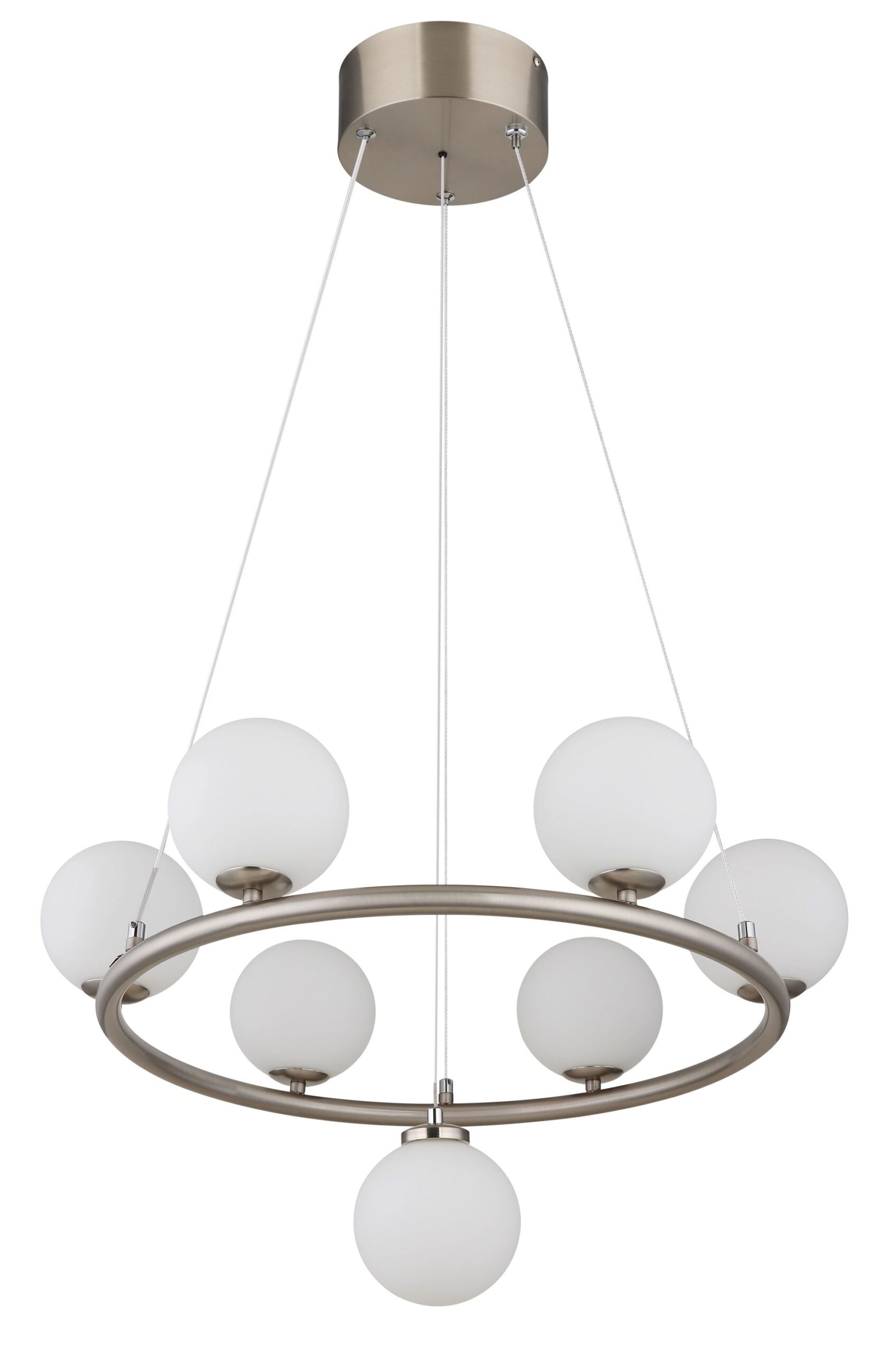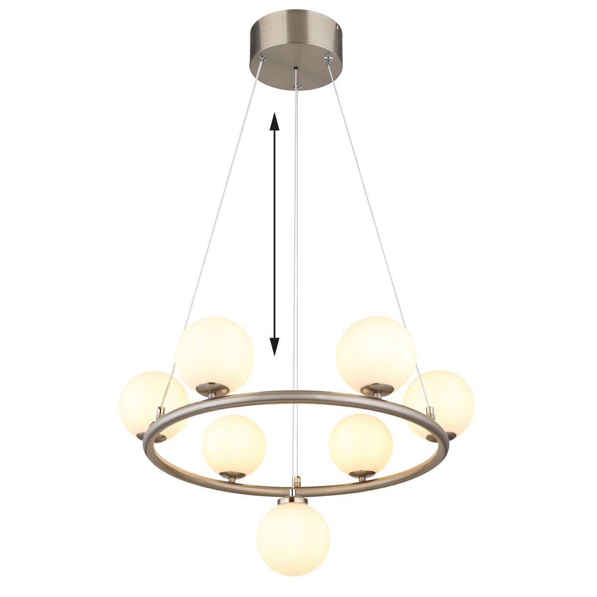 De RIHA hanglamp is een perfecte combinatie van moderne esthetiek en functionaliteit. Het ronde ontwerp, voorzien van vijf opale glazen bollen, zorgt voor een verfijnde uitstraling die elke ruimte verrijkt. Het matte nikkellichaam benadrukt het elegante karakter van de lamp en voegt een vleugje sophistication toe aan uw interieur. Met een lichtopbrengst van 310 lumen en een warme kleurtemperatuur van 3000 K, creëert deze lamp een gezellige en uitnodigende sfeer, ideaal voor zowel eetkamers als woonkamers.