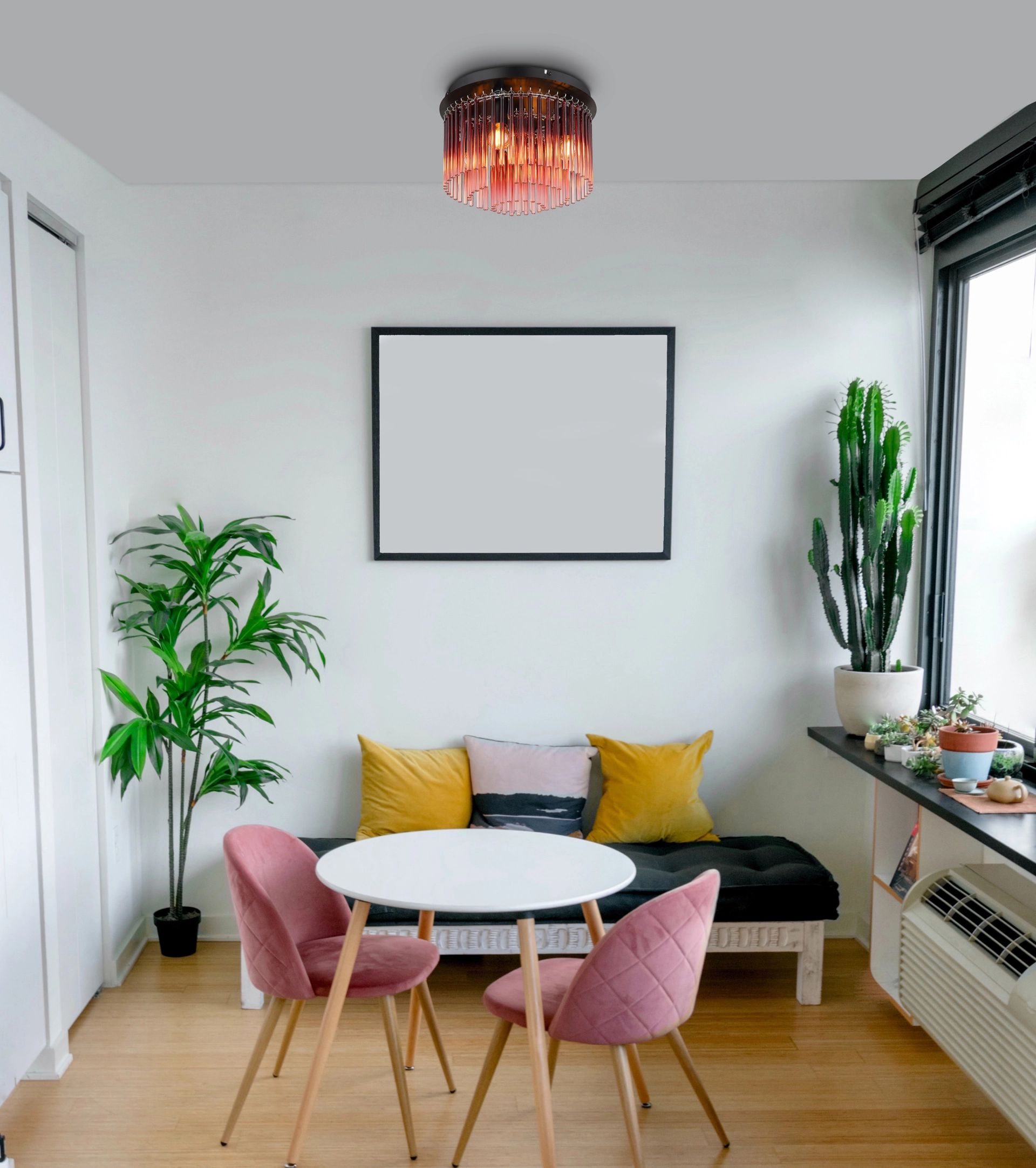 De GORLEY ronde plafondlamp is een prachtig voorbeeld van hedendaags design. De unieke kap, vervaardigd uit glasstaven, combineert moeiteloos bramenkleur, rood en helder glas, wat zorgt voor een warme en sfeervolle uitstraling. De lamp is afgewerkt met een behuizing van zwart gelakt metaal en een luxe chromen metalen accent, waardoor deze een bijzondere ambiance in iedere ruimte creëert. Met zijn ronde vorm is de GORLEY plafondlamp ideaal voor moderne woonkamers, commerciële ruimtes en architectonische toepassingen.
