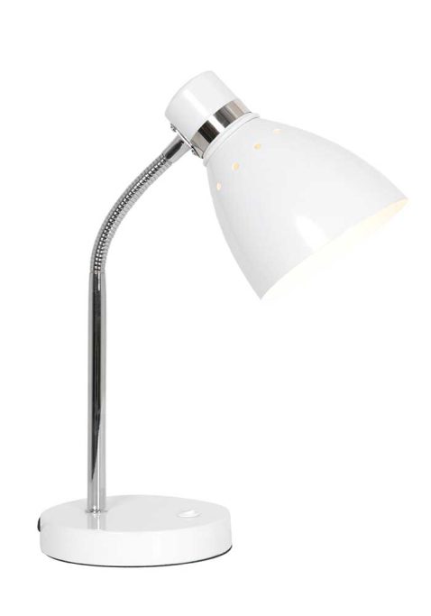De witte, moderne tafellamp van Steinhauer is opvallend in zijn eenvoud. Aan de bovenkant van de lampenkap loopt een stijlvolle zilveren band. De kap is tevens voorzien van gaatjes op gelijke afstand die het licht van de lamp doorlaten. Dit geeft een extra sfeervol effect aan de lamp. Stel zelf de hoogte van de kap in met de flexibele arm en draai de kap in de gewenste richting.
