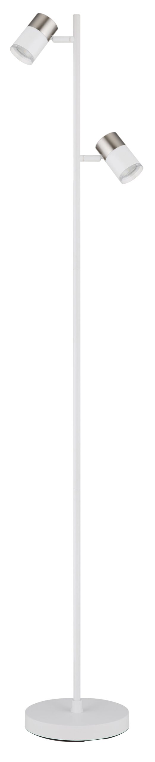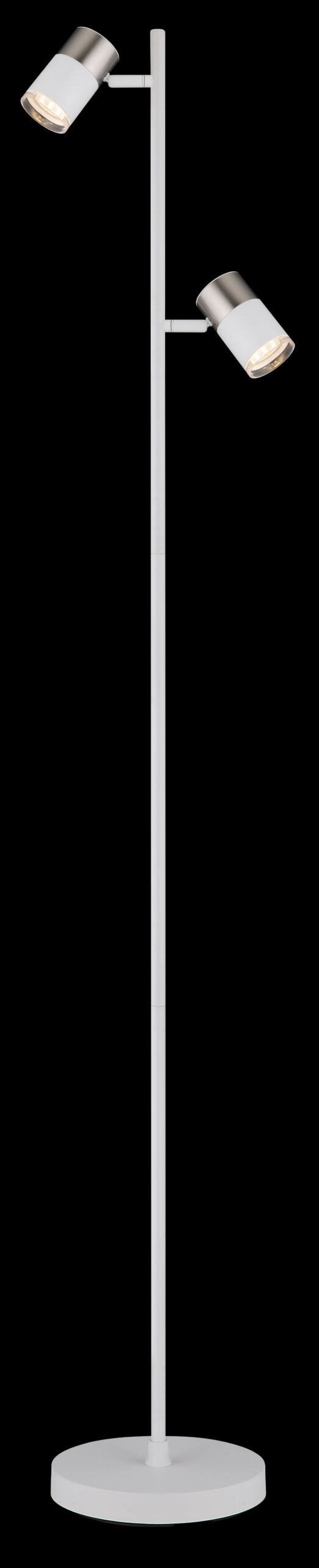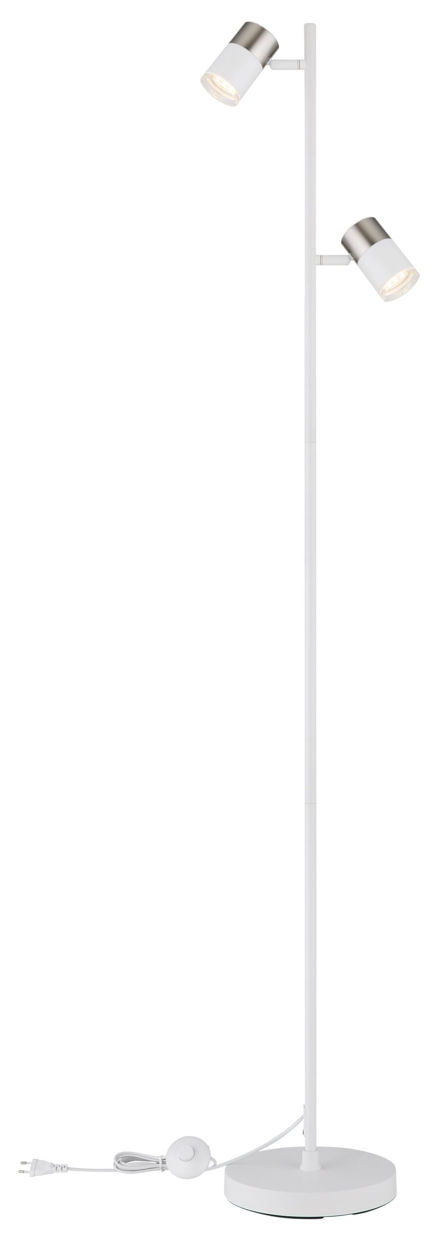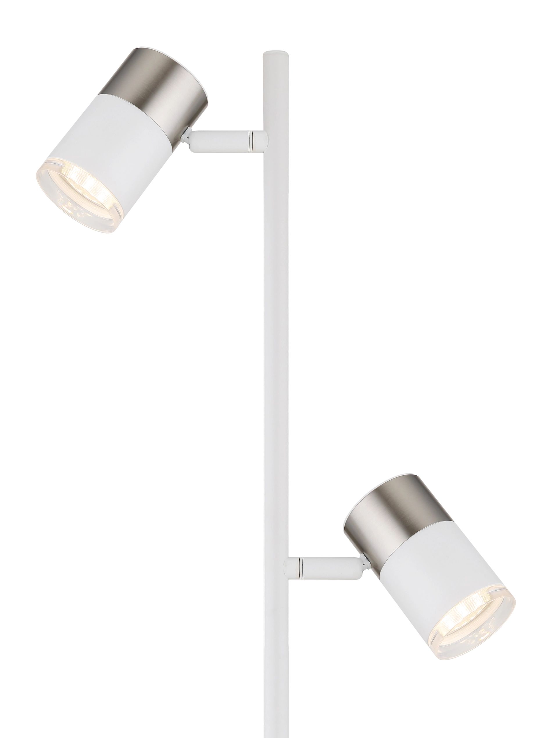 Deze moderne vloerlamp is een stijlvolle aanvulling voor jouw woonruimtes. Met een strakke buis en twee cilindrische spotlights, versierd met decoratieve ringen, biedt deze lamp een eigentijdse uitstraling. Gemaakt van mat wit metaal, is de lamp uitgerust met twee GU10 LED spotlights van gezamenlijk 5W. De lampenkappen zijn vervaardigd uit hoogwaardig aluminium in een combinatie van mat nikkel en wit, aangevuld met transparant kunststof, wat bijdraagt aan de elegante uitstraling.