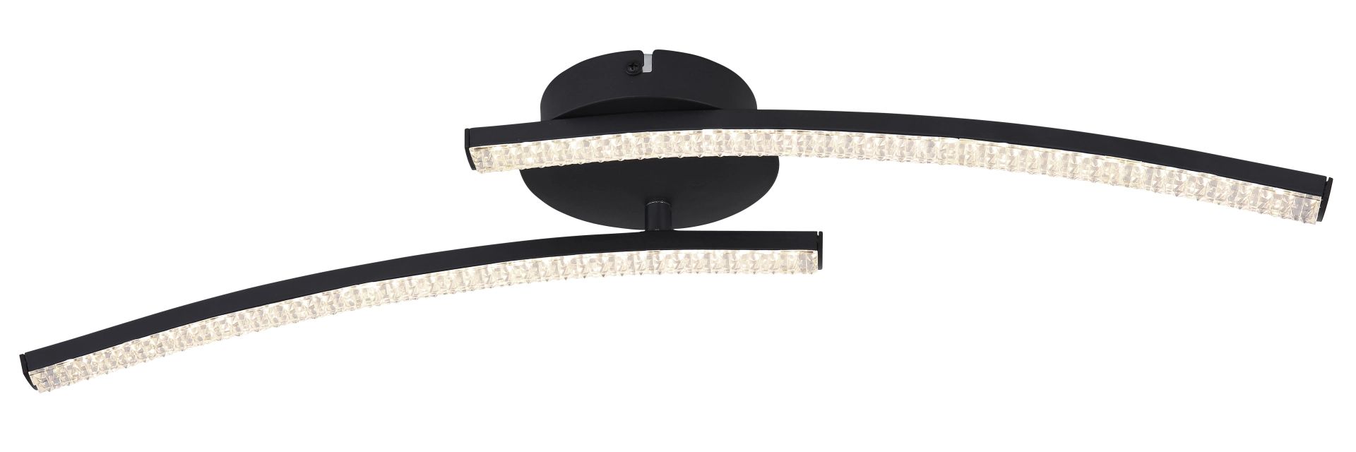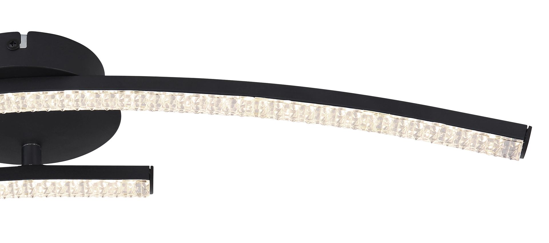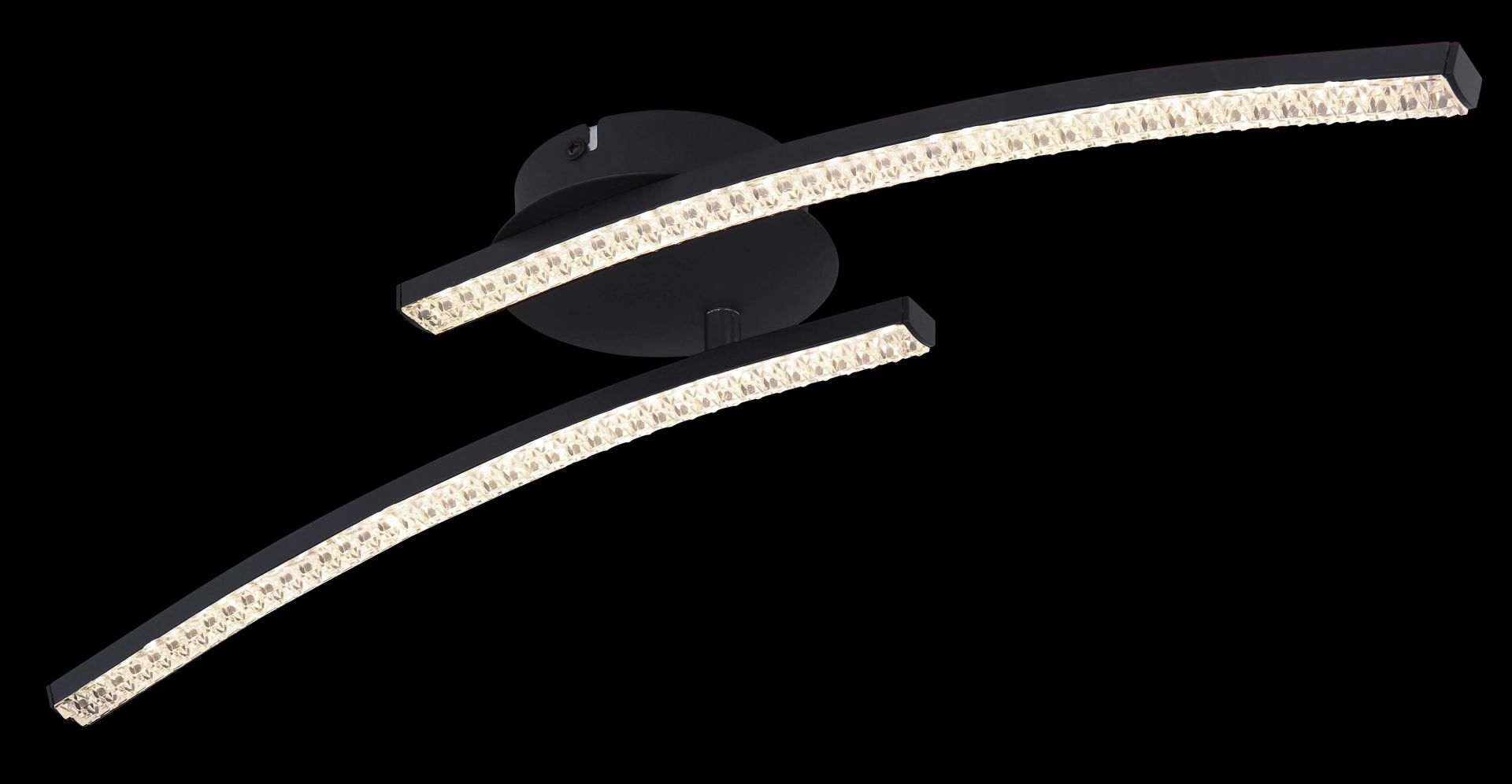 Deze moderne plafondlamp uit de Jules serie trekt de aandacht met zijn strakke en eenvoudige ontwerp van zwart mat metaal. Met een lengte van 59 cm bestaat de lamp uit twee robuuste metalen stangen die aan een ronde top zijn bevestigd. De combinatie van acryl en schitterende acryl kristallen geeft de lamp een luxe uitstraling. Onder het acryl bevinden zich de meegeleverde LED-lampen, die samen een krachtige verlichting van maar liefst 700 lumen leveren.